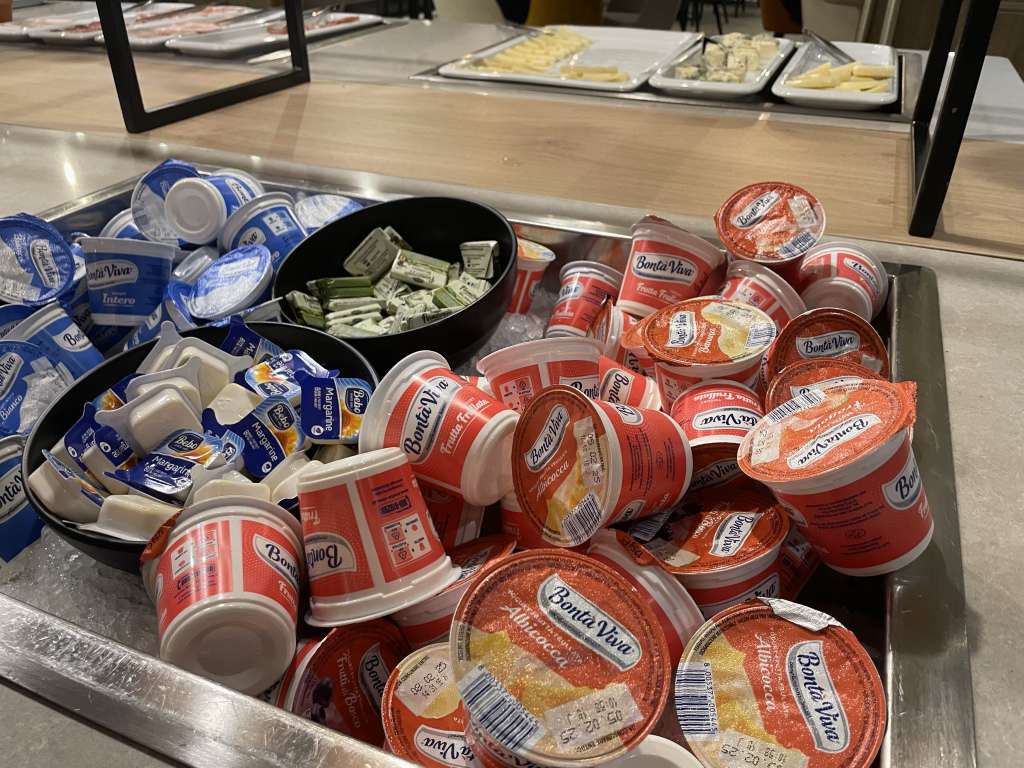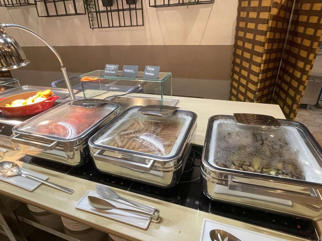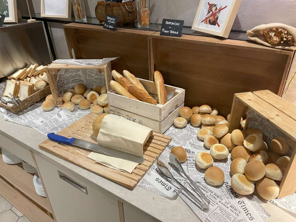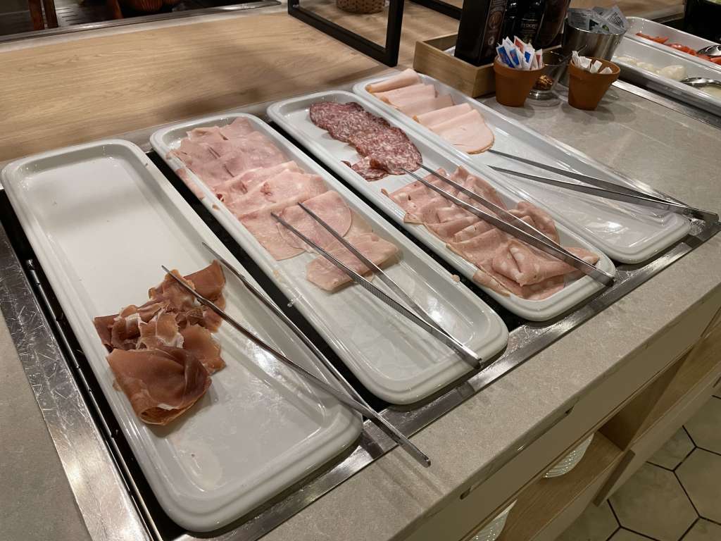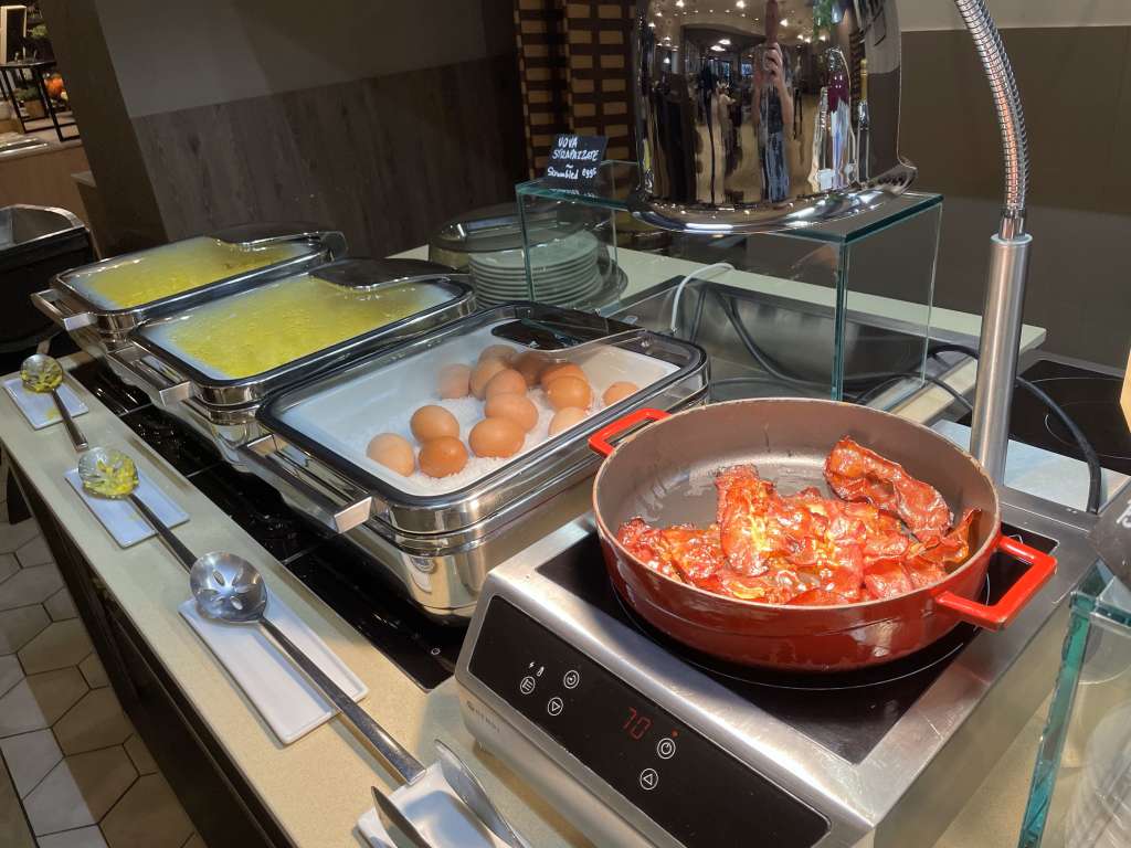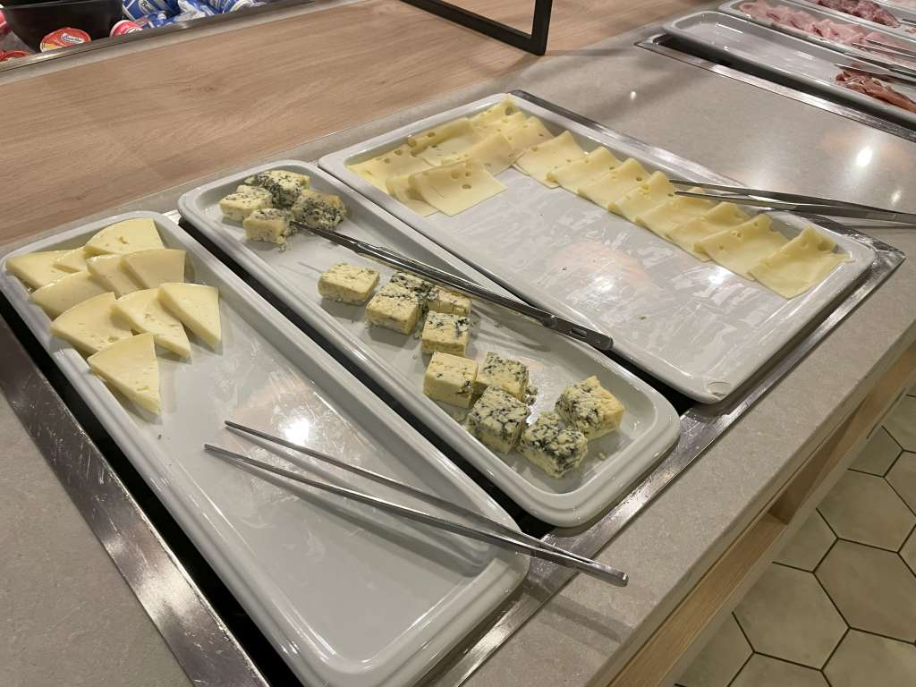 Das Frühstücksangebot des Holiday Inn Hotel Rome – Eur Parco Dei Medici bietet ein abwechslungsreiches und ansprechendes Buffet, das sowohl lokale italienische als auch internationale Vorlieben bedient. Es gibt eine reiche Auswahl an frischen Backwaren wie Croissants, Baguettes und Brötchen, ergänzt durch süße Spezialitäten wie Schokoladen-, Karotten-, Joghurt- und Pistazienkuchen sowie Muffins. Warme Gerichte wie Rühreier, Speck und Würstchen, frisches Obst (Äpfel, Bananen, Orangen, Kiwis), Joghurt, Müslis, Käse- und Wurstwaren (z. B. Schinken, Salami, Blauschimmelkäse) sowie Gemüse wie Tomaten, Mozzarella und Salat runden das Angebot ab. Marmeladen, Honig, Butter und eine moderne Getränkestation mit Säften und Infused Water sorgen für weitere Vielfalt.
