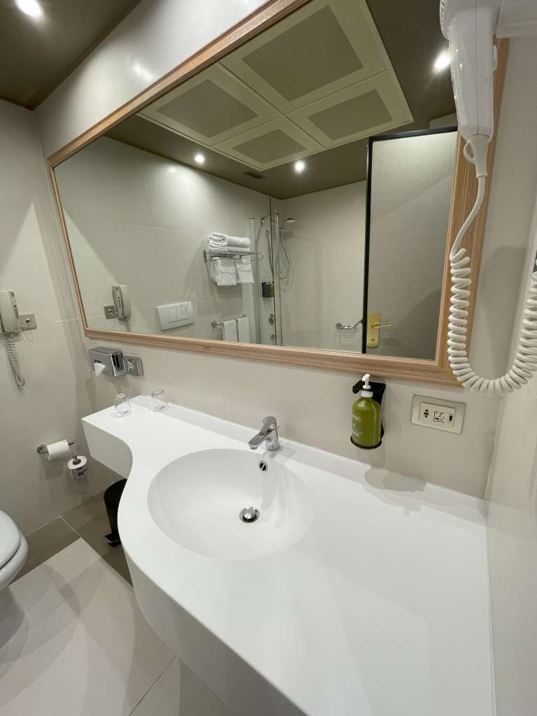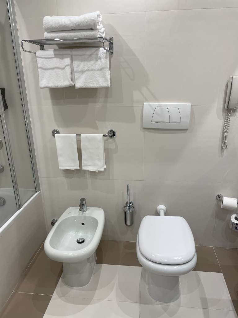 Es gibt einen großen Spiegel mit einem Holzrahmen, der dem Raum eine warme Note verleiht, sowie einen Föhn, der direkt an der Wand montiert ist – ein praktisches Extra für Reisende. Das Badezimmer ist mit einer weißen Toilette und einem Bidet ausgestattet, die in einem einheitlichen, modernen Design gehalten sind. Eine Toilette war natürlich ebenso vorhanden, wie das für italienische Badezimmer typische Bidet.