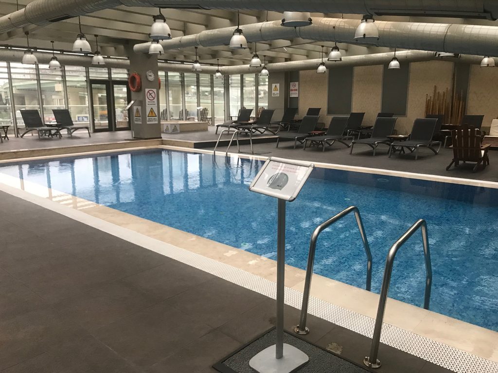 Eine Etage tiefer findet sich ein großer SPA-Bereich, in dem auch ein Frisörsalon eigerichtet ist. Kurz dahinter liegt der Pool, der angenehm beheizt und sehr gepflegt war.