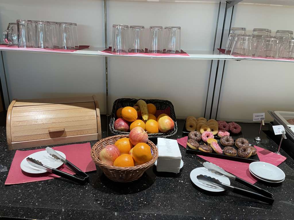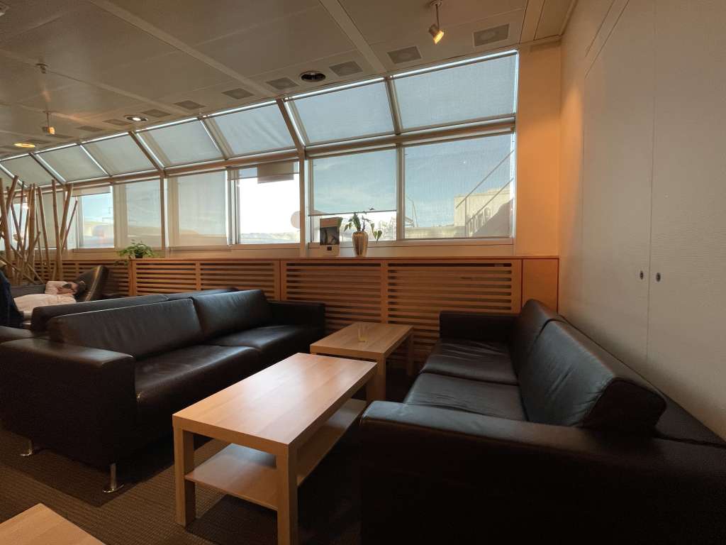 Die Lounge besteht eigentlich nur aus einem einengenden Raum. Direkt links von der Rezeption befindet sich ein überschaubarer Bereich für das Buffet. Der Rest der Lounge ist mit Sitzmöbeln zugepflastert. Am rechten Ende des Raumes gibt es noch einen VIP-Bereich. Und ich beglückwünsche jeden, der sich dort niederlassen darf, denn es war echt voll und dadurch wirklich unangenehm. Und nicht nur, weil der eine Typ mitten am Tag die Schuhe ausgezogen und sich auf der Couch lang gemacht hat.