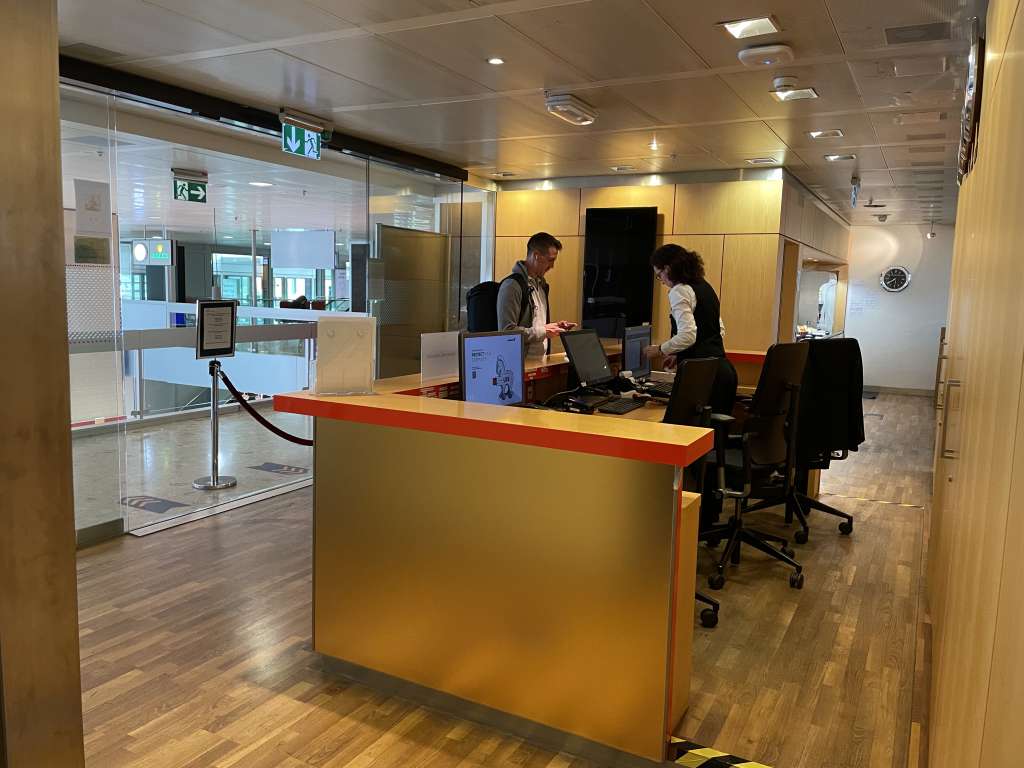 Stellt euch die Lounge so vor: Ihr kommt durch die Tür rein und steht vor dem Empfang. Das ist klug gelöst, denn von dort ist es schwer, das Übel zu erkennen, da hinter dem Empfang eine Wand und die Lounge durch einen Spalt links betreten werden kann. Daher scannt ihr erst die Bordkarte, bevor ihr mehr über die Lounge erfahren könnt. Natürlich nur, wenn ihr diese Review überlesen habt.