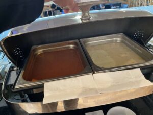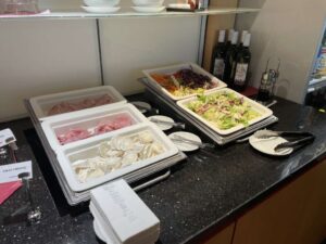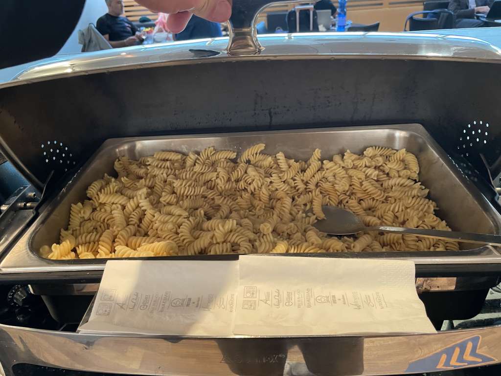 Okay, die Lounge war klein und das Buffet musste entsprechend platzsparend untergebracht werden. Und trotzdem war es ein Downgrade zur Crystal Lounge bei den C-Gates. Zwar gab es ein paar mehr Dinge zur Auswahl, aber die Präsentation war wirklich gruselig. Und während das Angebot an warmen Speisen in allen Lounges wirklich so brutal billig war, wurde in der Horizon Lounge noch einmal abgespeckt. Es gab dieselben Spiralnudeln wie in der Crystal Lounge, aber man hat einfach das Fleisch aus der Bolognese weggelassen und eine einfache Tomatensoße angeboten. Neben irgendeiner weißen Soße. Aber schaut euch bitte diesen Berg an Nudeln an.
