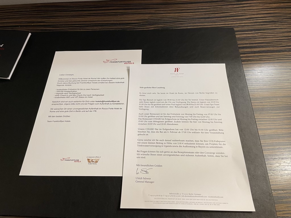 Gebucht habe ich das Hotel de Rome in Berlin über unser Frankfurtflyer Hotel Portal, da man hierüber Zugang zu den Rocco Forte Nights und auch Virtuose Raten bekommt, welche ohne Aufpreis Vorteile wie kostenloses Frühstück, ein Upgrade, 100 Euro Guthaben und weitere Vorteile erhält, was gerade bei einer Nacht ein extrem guter Deal ist.
