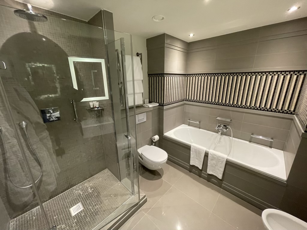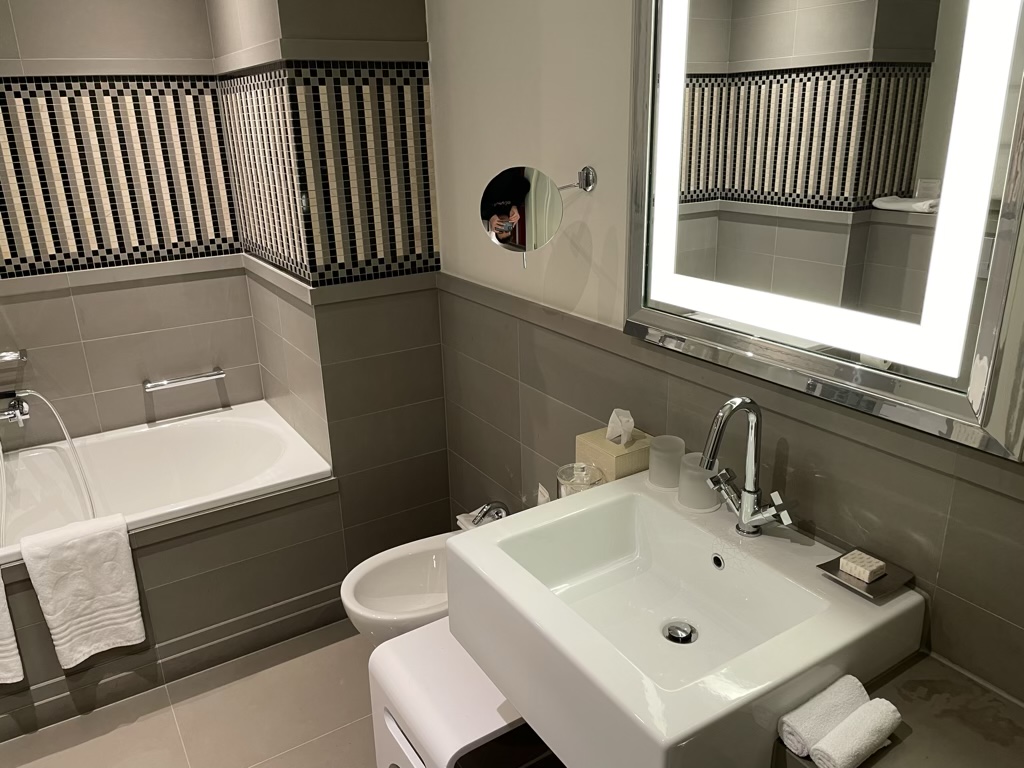 Im Badezimmer selbst merkte man dann doch, dass das Hotel etwas älter war, wobei alles perfekt in Schuss war und auch bestens funktionierte. Vielleicht erinnerte mich der Rocco Forte Style auch einfach zu sehr an vergangene Glanzzeiten, sodass ich diese Assoziation hatte.