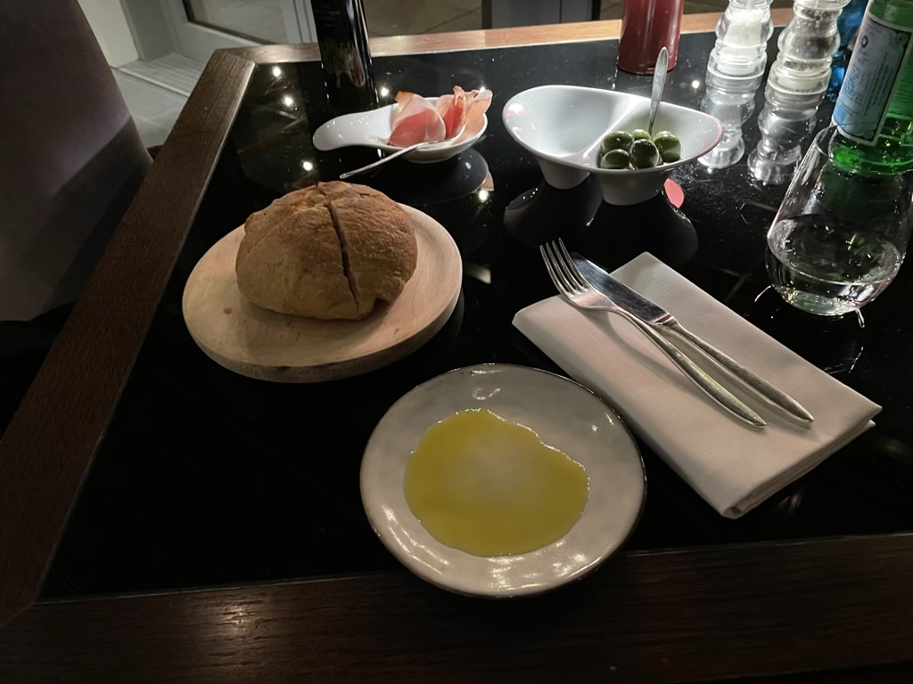 Zu Beginn wurde mir frisches Brot mit Olivenöl gereicht, sowie Parmaschinken und Oliven, welches ich tatsächlich zusammen mit meinem Wasser und Negroni genossen habe, während ich auf die Vorspeise gewartet habe.