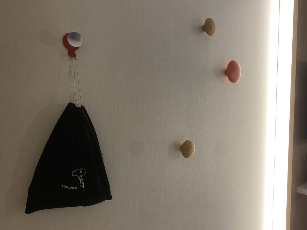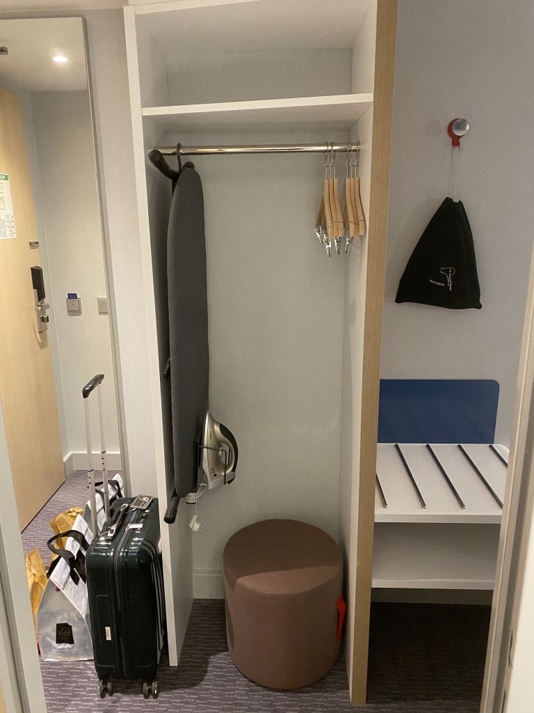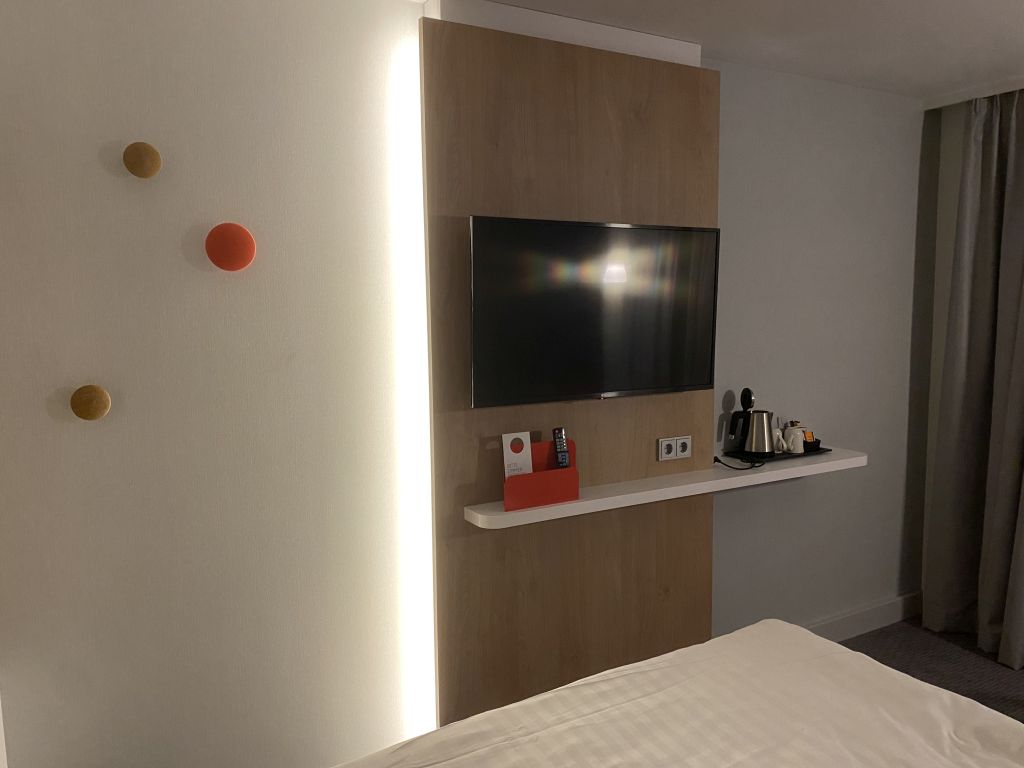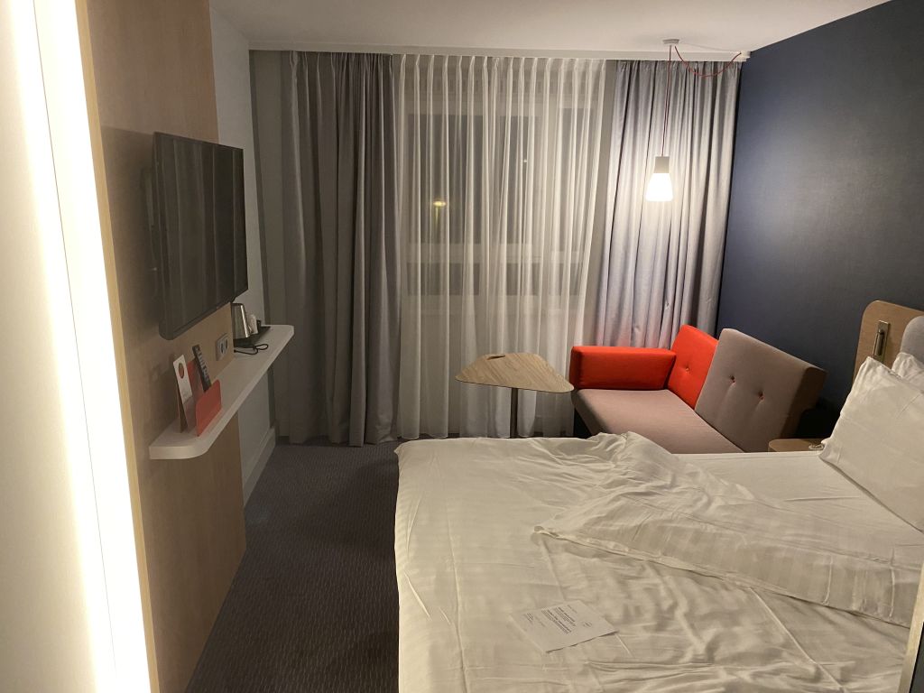Die renovierten Holiday Inn Zimmer ähneln sich ja doch sehr stark. Ein Bett (manchmal auch zwei), in den größeren Räumen eine kleine Couch, die auch als Bett umfunktioniert werden kann, mit Tisch, der Fernseher an der Wand direkt neben ein paar Garderoben-Haken, an dem auch der Fön in einem kleinen Söckchen baumelt. Bügeleisen und Bügelbrett befinden sich in einer Nische, die auch als Kleiderschrank-Ersatz gilt.
