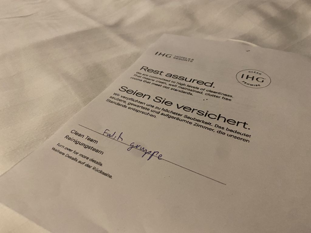 Das Zimmer hatte dann ein Queensize-Bett, ausreichend Platz und es lag zumindest ein Zettel des externen House-Keepings auf dem Bett. Daher alles fein für mich und diese Nacht.