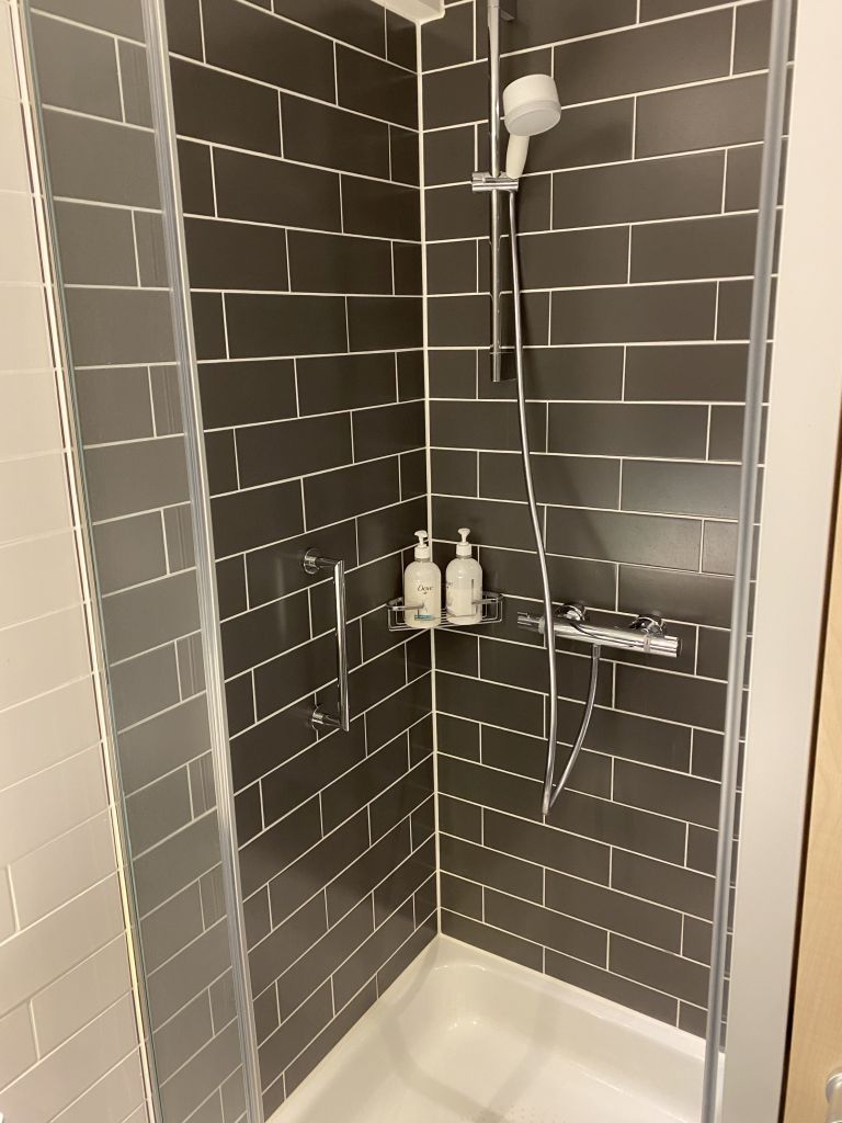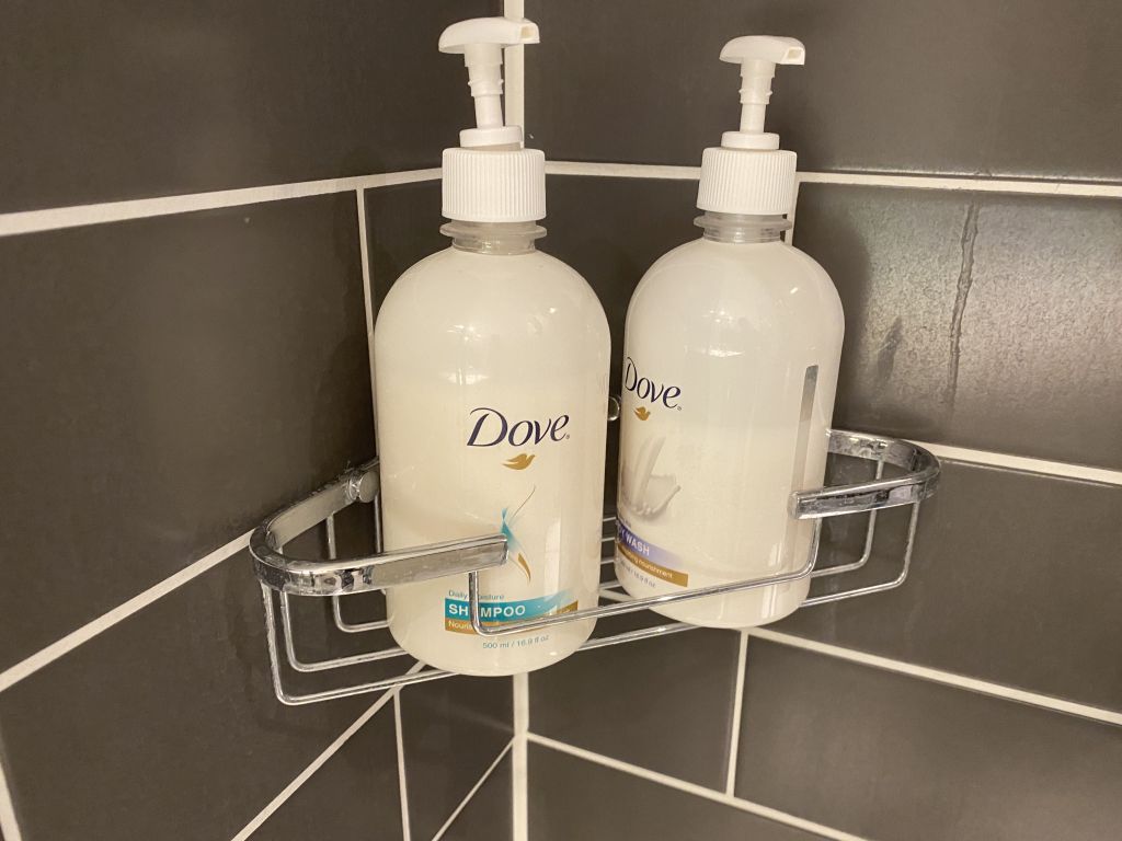 Die Pflegeprodukte – in dem Fall Shampoo und Duschbad – stammen von der Marke Dove und wurden in großen Spendern bereitgestellt.