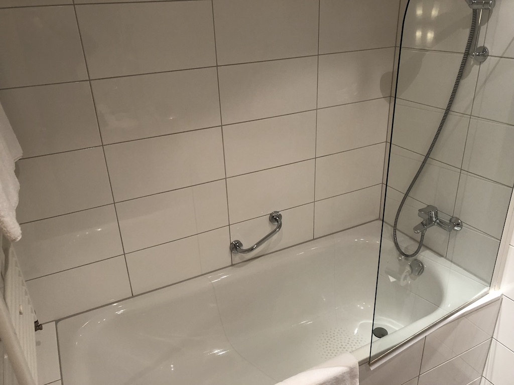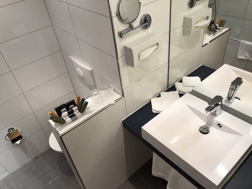 Zur rechten befindet sich das Bad, welches es in diesem Hotel in zwei Ausführungen gibt – entweder mit Dusche, oder mit Badewanne. Die Badezimmer-Amenities von four elements waren ausreichend vorhanden und ich empfand sie als hochwertig. Kleines Manko in der Dusche war der etwas schwache Wasserdruck.