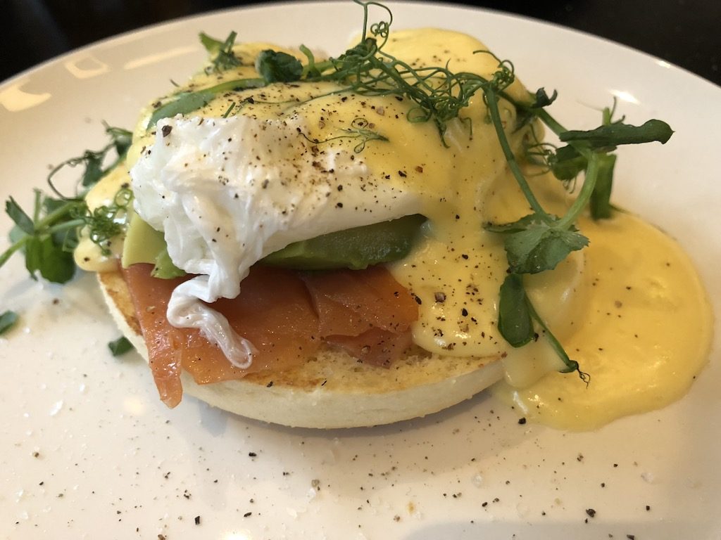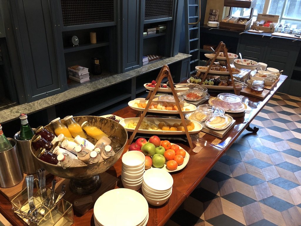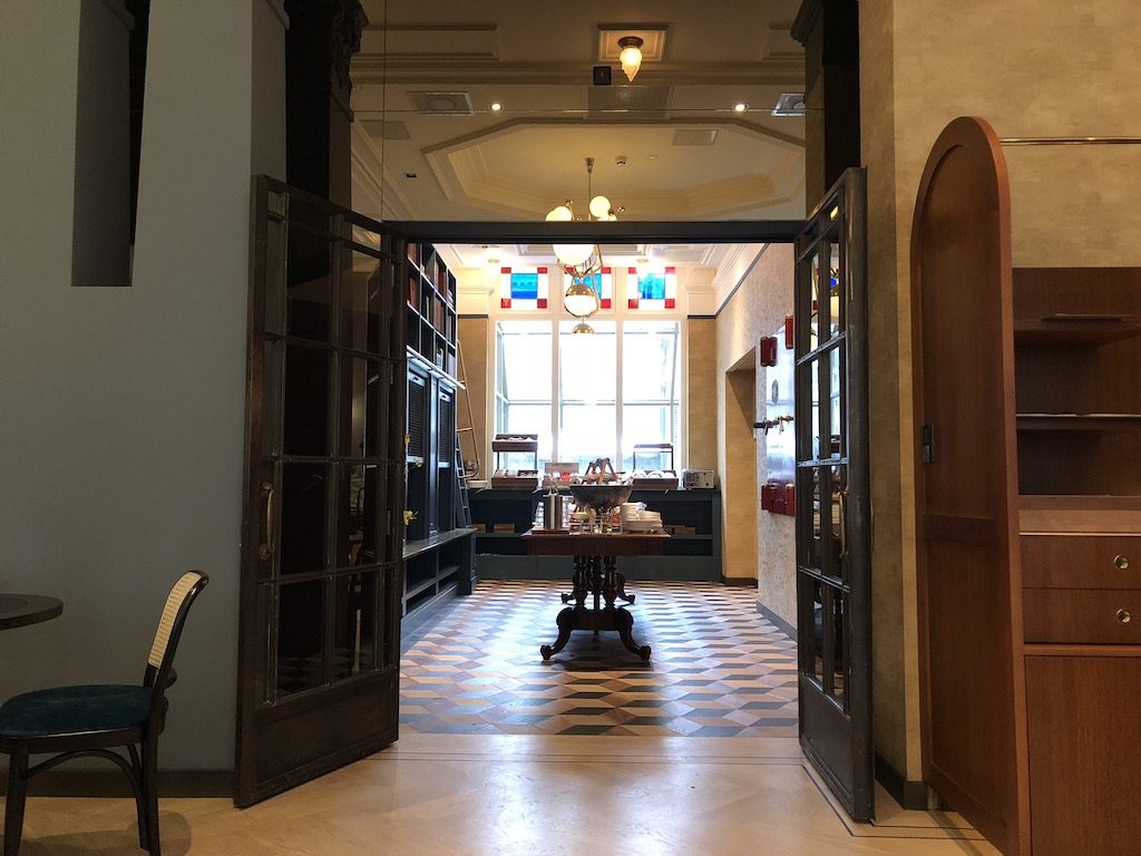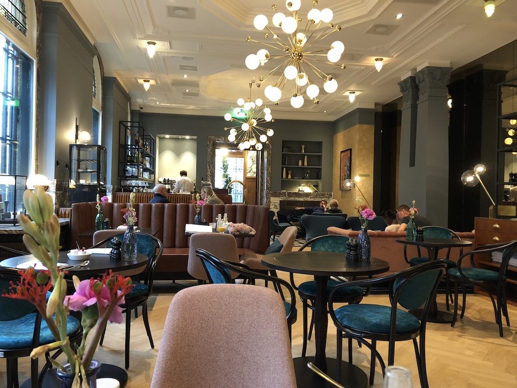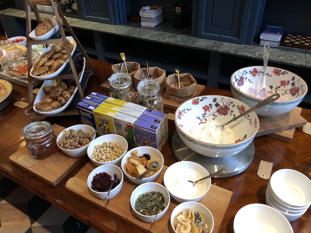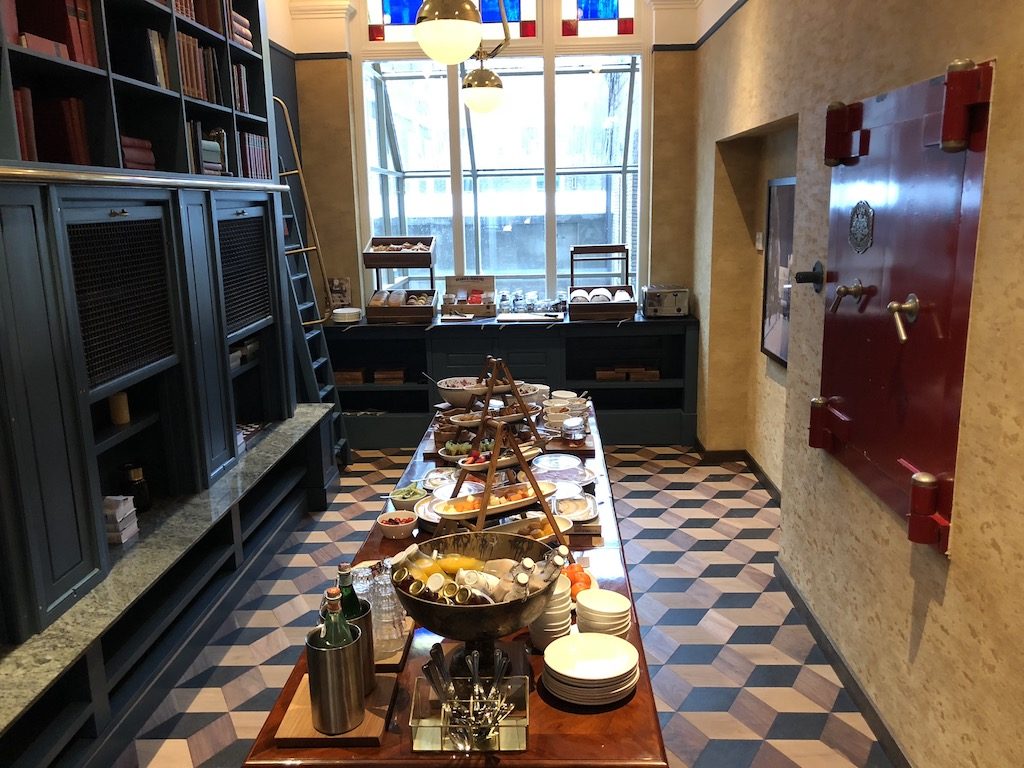 Das Frühstücksrestaurant befindet sich angrenzend zur Lobby im Erdgeschoss. Erneut wurde das Bank-Design durchgezogen. Neben dem regulären Buffet, welches bereits eine große Auswahl an Cerealien, Brot, Wurst, Käse, Aufstrichen, Obst und Säften bot, wird zusätzlich ein À-la-Carte Menü gereicht, aus welchem wir uns Eggs Royal Benedict und einen traditionellen Kuchen aus Den Haag, den „Haagsche Kakker“ wählten. Sehr lecker!