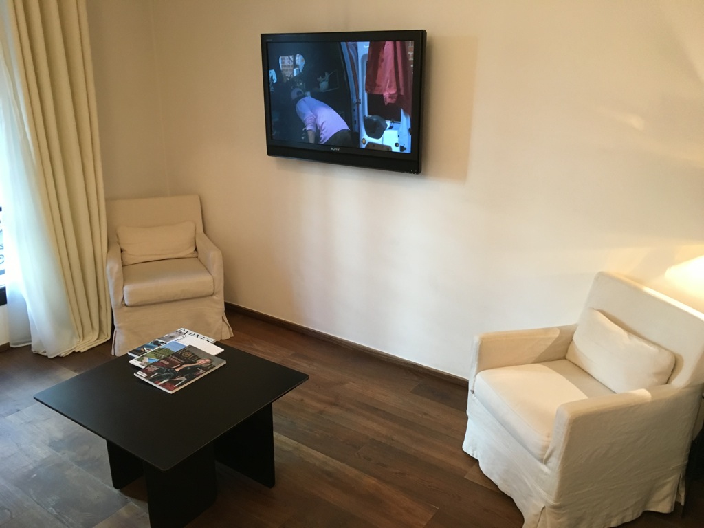 Der Wohnbereich verfügte wie auch das Bett über einen eigenen Fernseher. Was ich sehr interessant fand war, dass sich beide TV Geräte mit der selben Fernbedienung steuern ließen, je nachdem auf welches Gerät man zeigte.