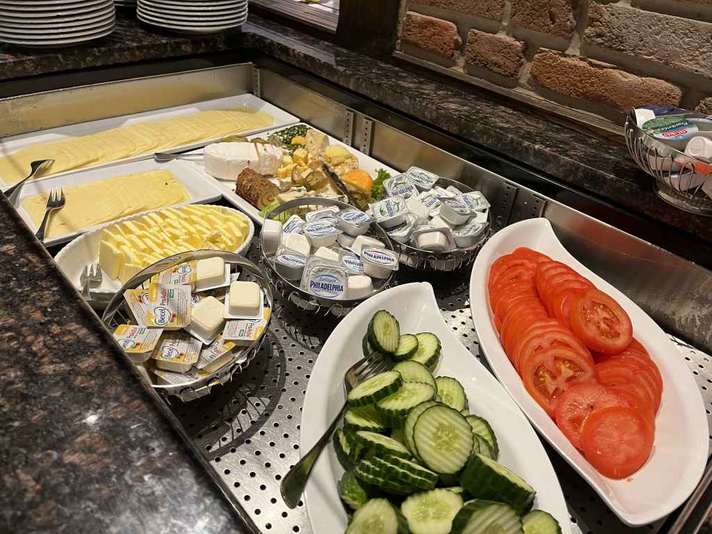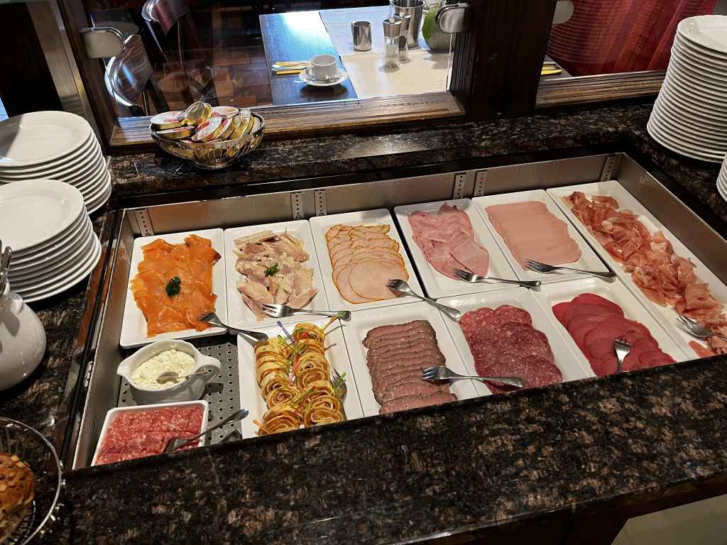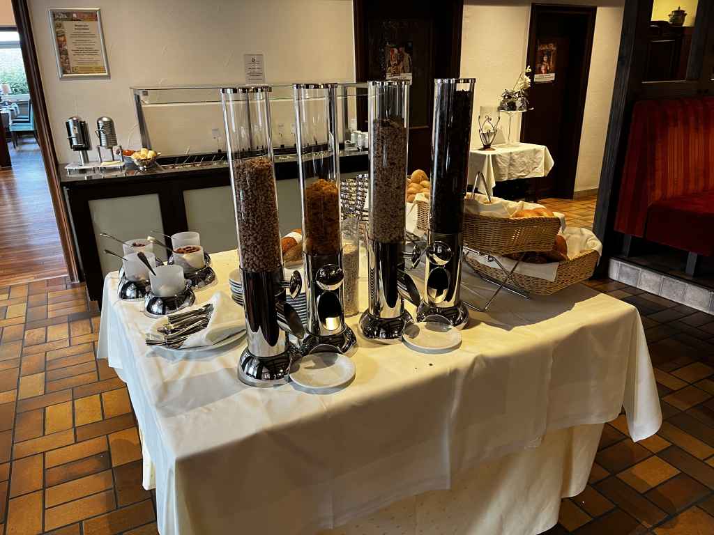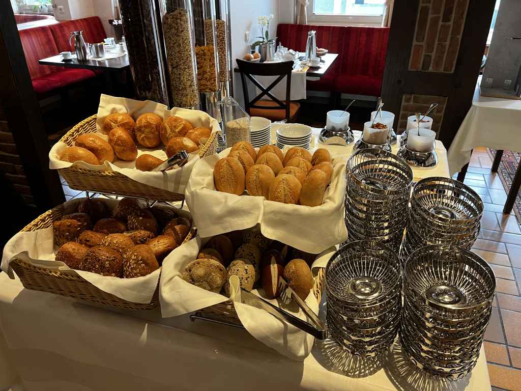 Das Frühstück bietet eine Station mit Cerealien und diversen leckeren Brötchen. Als Belag und Aufstrich stehen qualitativ höherwertige Wurst- und Käsesorten genauso wie Marmeladen im Angebot. Es gibt aber auch Mett und Fisch.