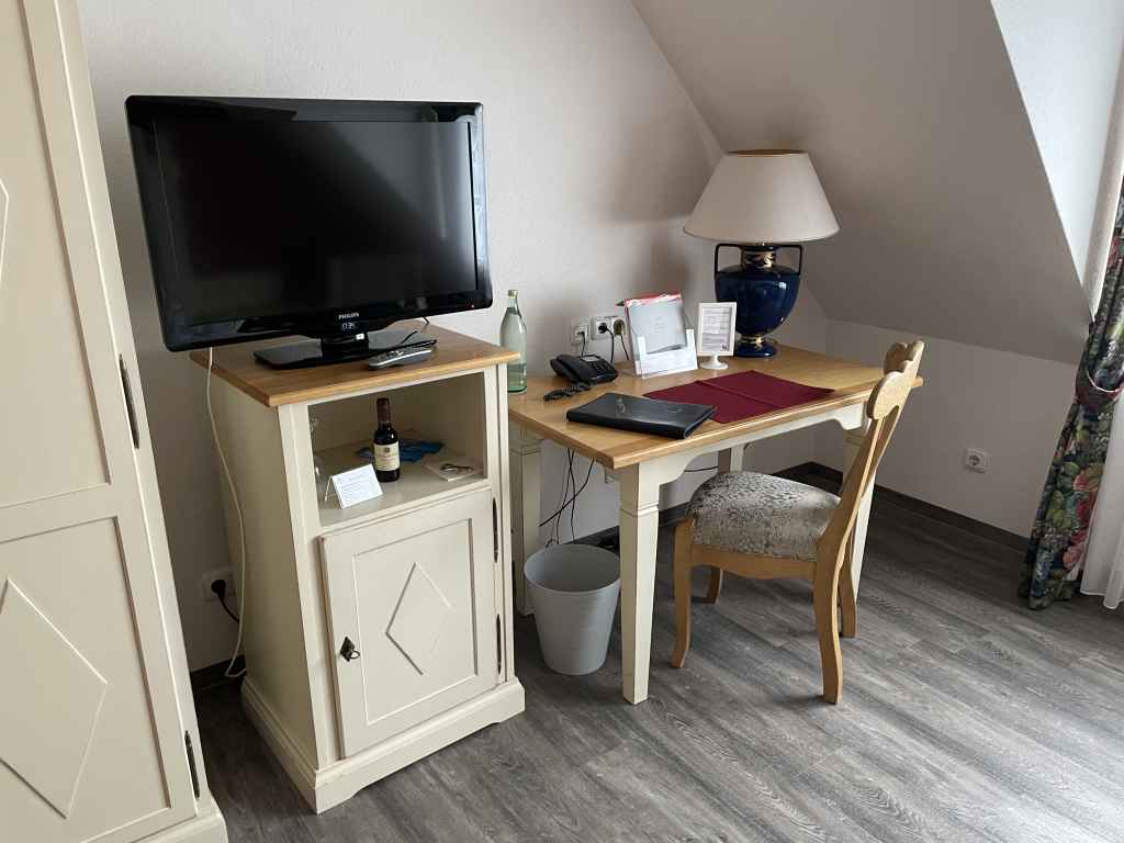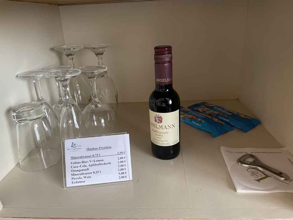 Neben dem Schreibtisch befindet sich zunächst die voll bestückte und sehr preiswerte Minibar. Darauf steht auch der Flachbildfernseher. Und noch etwas weiter daneben gibt es einen Schrank, der ausreichend Platz für die Garderobe bietet. Im Schrank fand ich auch zusätzliche Handtücher für den Besuch des Wellness-Bereiches.