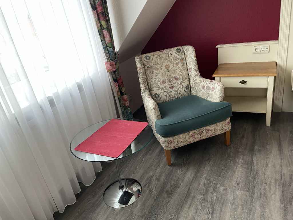 Außerdem steht nur etwas abseits vom Bett ein Sessel mit einem Beistelltisch mit Glasplatte, von dem man alternativ noch etwas Fernsehen oder ein Buch lesen kann. Arbeiten lässt es sich an einem separaten Holz-Schreibtisch mit passendem Stuhl.