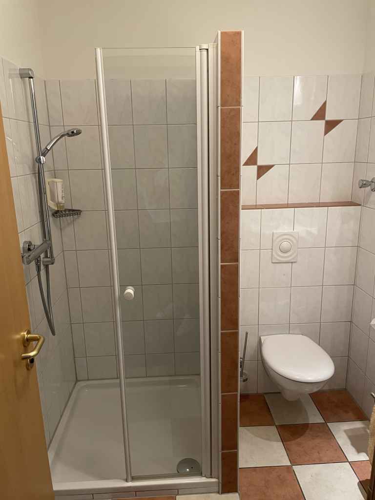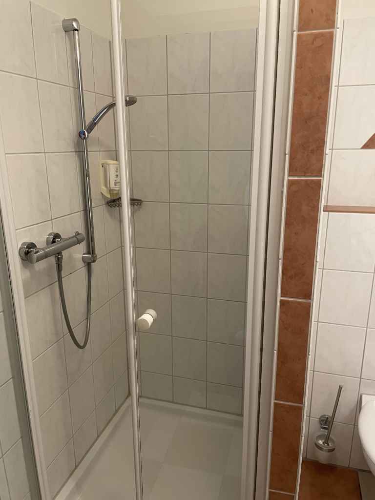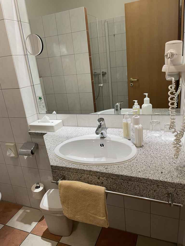 Das Badezimmer ist nicht groß, aber ausreichend großzügig gestaltet, um keine Raumangst zu bekommen. Es gibt eine Dusche, Toilette und einen Waschtisch. Duschbad und Seife kommen aus dem Spender und der Fön ist an der Wand montiert.