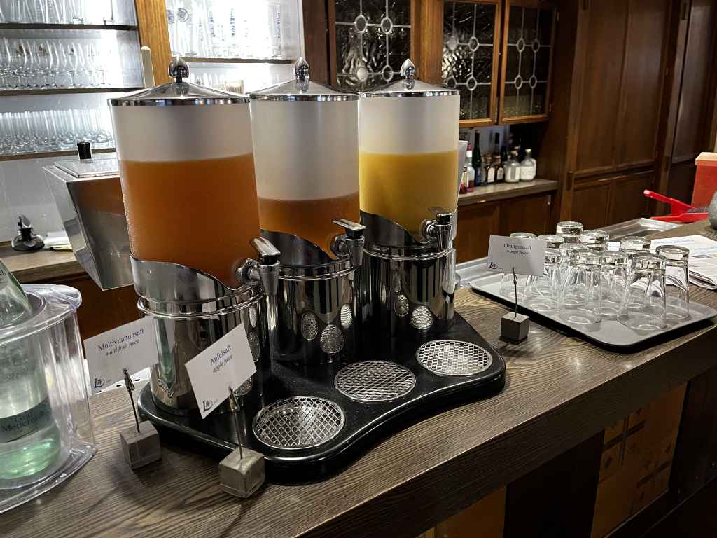 Kaffee wird direkt am Tisch serviert. Säfte und Tees stehen zur Selbstbedienung bereit.