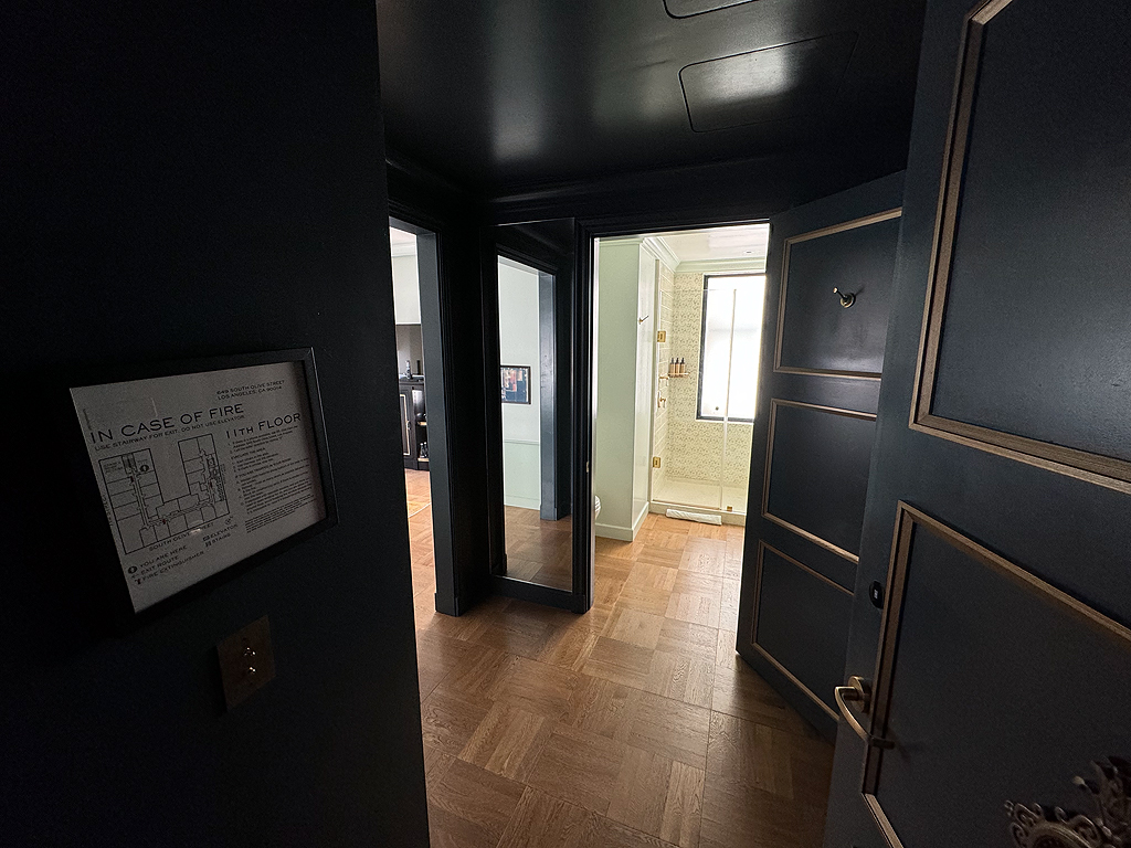 In der Ecke der beiden Fensterseiten gab es einen Sessel mit einem kleinen Tisch. Gegenüber in der Ecke Richtung Badezimmer befindet sich der Kleiderschrank.