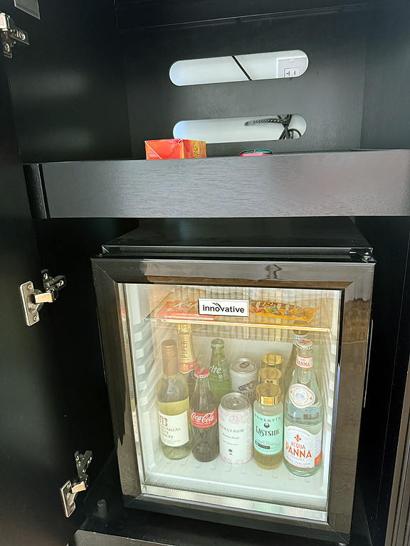 Gegenüber dem Bett ist eine Art Kommode mit einem Fernseher drauf. In der Kommode befindet sich die gut gefüllte (kostenpflichtige) Minibar.