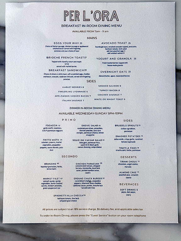 Das Hotel erhebt eine Destination Fee in Höhe von 35 USD pro Tag. Diese war in meiner Rate von 295 USD bereits enthalten und wurde nicht noch zusätzlich berechnet. Im Gegensatz zu vielen Hotels, die diese Zusatzgebühr mit „Mickey Maus“ Benefits rechtfertigen, erhaltet Ihr im Hotel Per La dafür einen sinnvollen Gegenwert. Zunächst sind es 35 USD Hotelguthaben pro Tag, die Euch gutgeschrieben, aber nicht auf die Zimmerrate angerechnet werden. Zusätzlich erhaltet Ihr in der Happy Hour (17-18 Uhr) an der Poolbar bis zu zwei Gläser Wein. Darüber hinaus legt das Hotel zwei Nachtische obendrauf, wenn Ihr im Hotel abends essengeht.