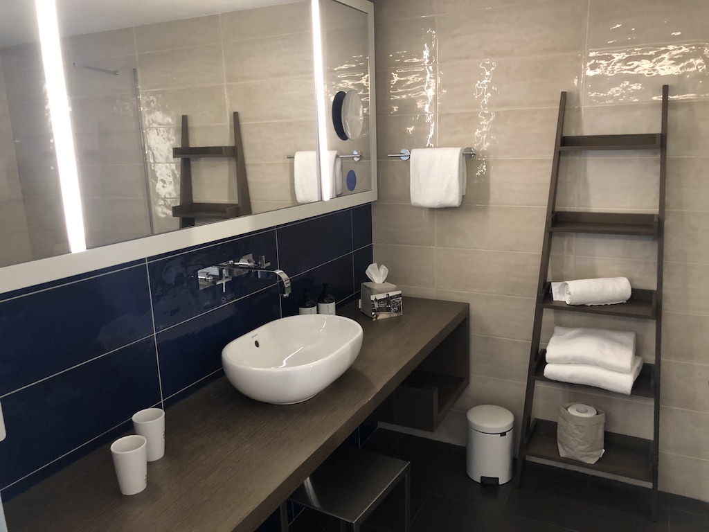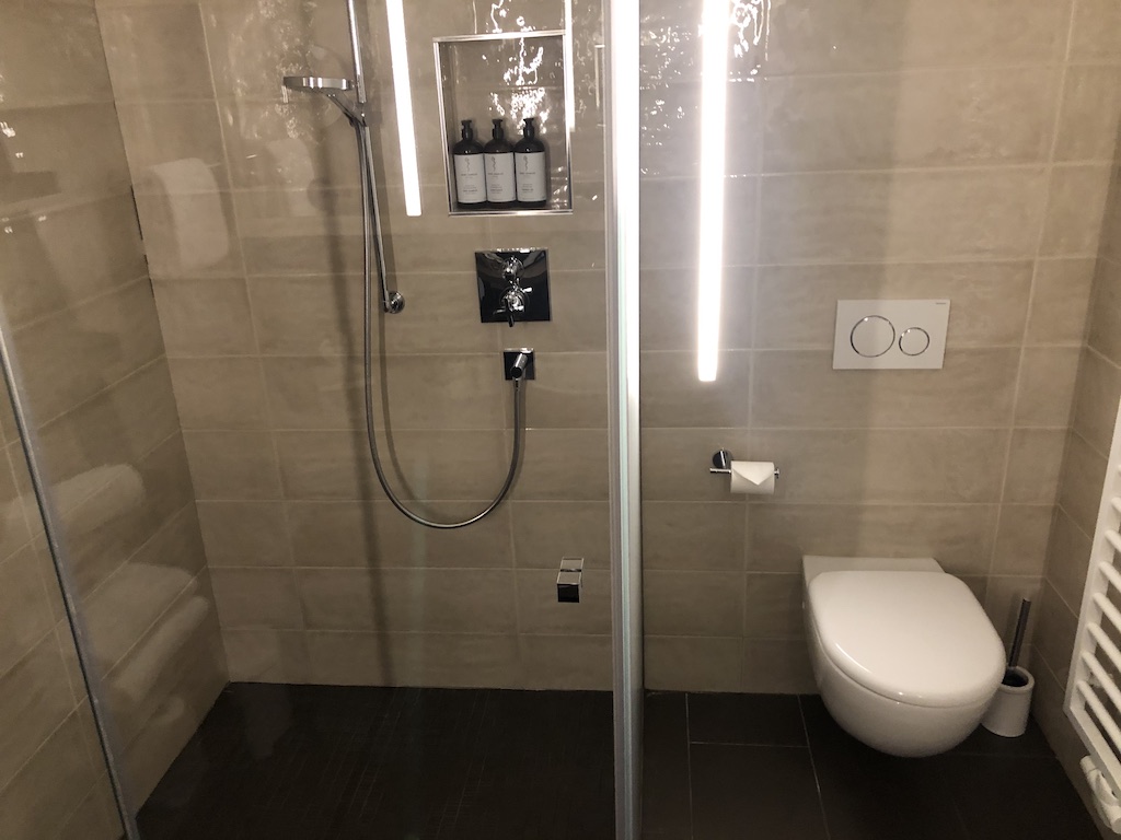 Das Badezimmer ist geräumig und bietet eine riesige Dusche. Pflegeprodukte stehen in großen Spendern zur Verfügung und sind auch im Hotelshop erhältlich.