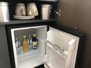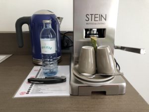 Weitere Annehmlichkeiten sind eine Espressomaschine, Wasserkocher und die Minibar mit Softdrinks.