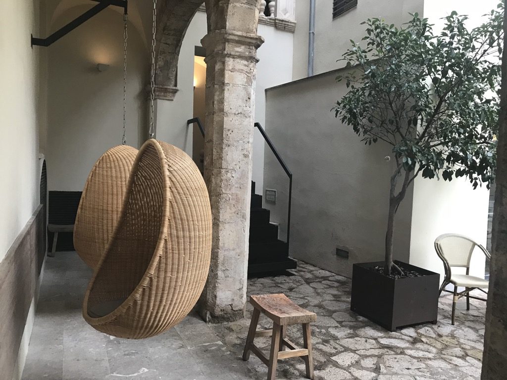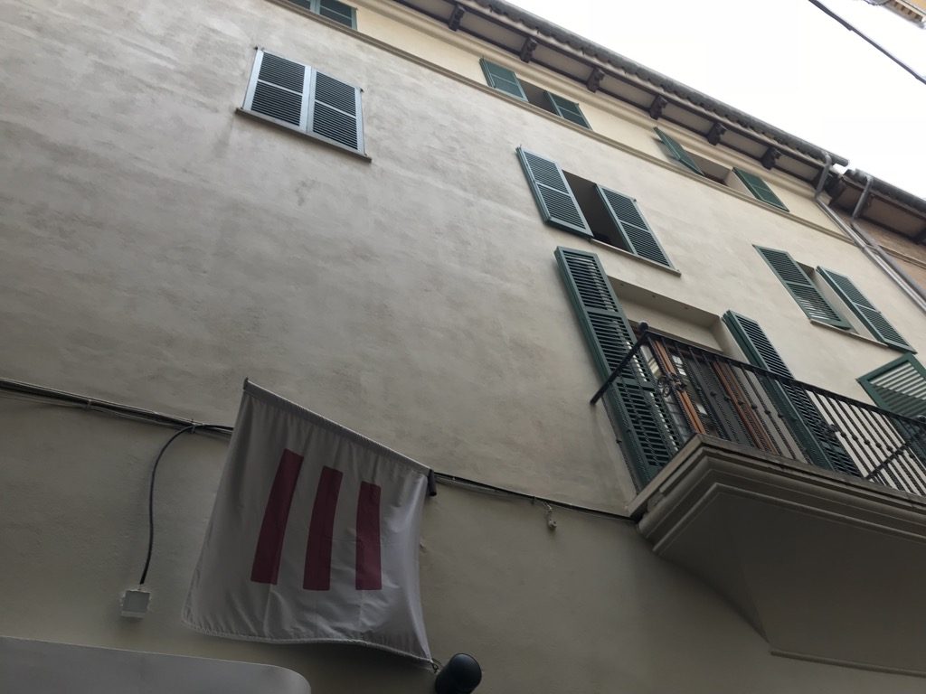 Nach dem Erstflug mit Laudamotion nahm ich mir ein Taxi nach Palma de Mallorca. Ich hatte nur eine Nacht bis zu meinem Rückflug, deshalb wollte ich möglichst zentral in Palma de Mallorca wohnen, um die Altstadt, den Hafen und das Meer zu besuchen. Auf booking.com habe ich das Hotel Tres gefunden. Die zentrale Lage, die Optik und die Bewertungen haben mich direkt angesprochen. Ich habe mich am Kreisel, direkt um die Ecke des Hotels absetzen lassen und bin die kleine Gasse zum Hotel zu Fuß gelaufen. Im ersten Moment war der Eingang sehr unscheinbar, aber was sich dahinter verbarg, war beeindruckend.