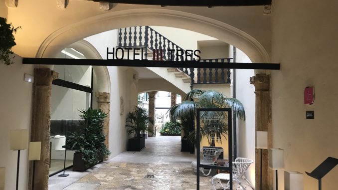 Nach dem Erstflug mit Laudamotion nahm ich mir ein Taxi nach Palma de Mallorca. Ich hatte nur eine Nacht bis zu meinem Rückflug, deshalb wollte ich möglichst zentral in Palma de Mallorca wohnen, um die Altstadt, den Hafen und das Meer zu besuchen. Auf booking.com habe ich das Hotel Tres gefunden. Die zentrale Lage, die Optik und die Bewertungen haben mich direkt angesprochen. Ich habe mich am Kreisel, direkt um die Ecke des Hotels absetzen lassen und bin die kleine Gasse zum Hotel zu Fuß gelaufen. Im ersten Moment war der Eingang sehr unscheinbar, aber was sich dahinter verbarg, war beeindruckend.