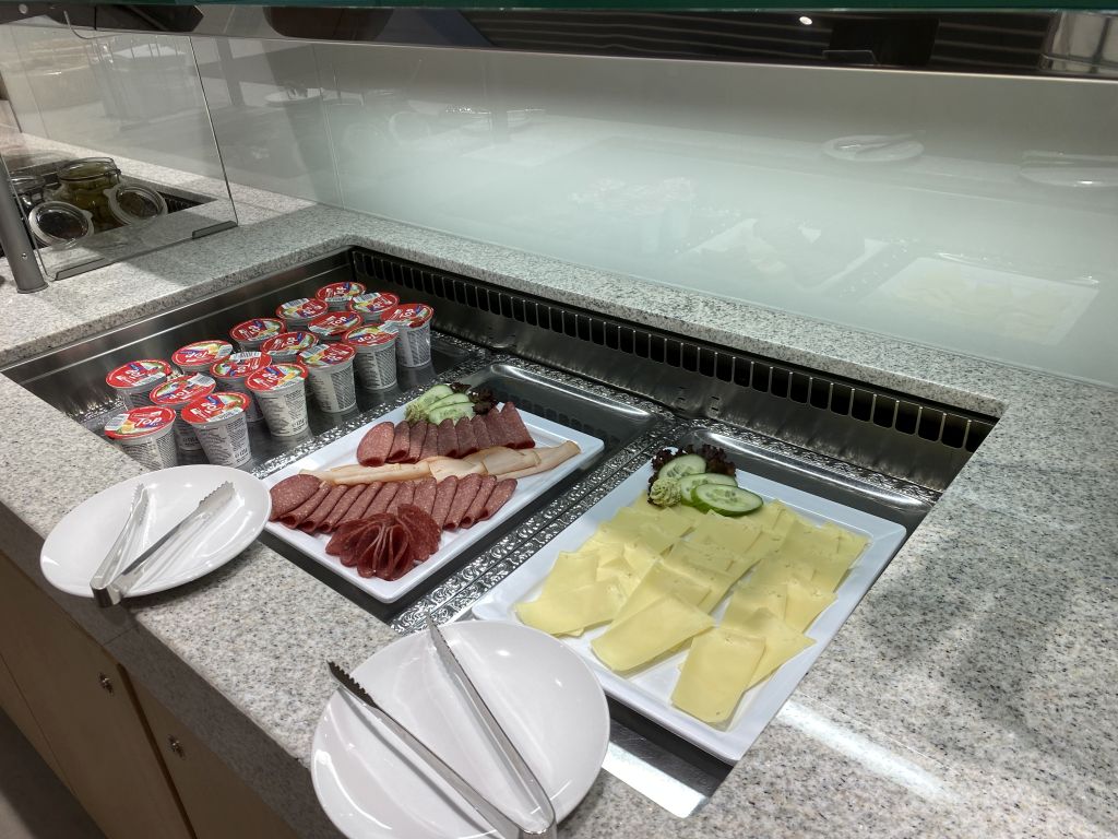 Büffet und Getränkeauswahl sind auf beiden Etagen nahezu identisch. Während unseres Aufenthalts gab es noch ein Frühstücksbüffet. Neben Brötchen, Wurst- und Käseaufschnitt gab es auch süßen Brotaufstrich (Honig, Marmelade, Nutella), etwas Salat, frisches Obst, Müsli und Joghurt. Als warme Speisen standen zum Frühstück nur Bockwürsten zur Verfügung.