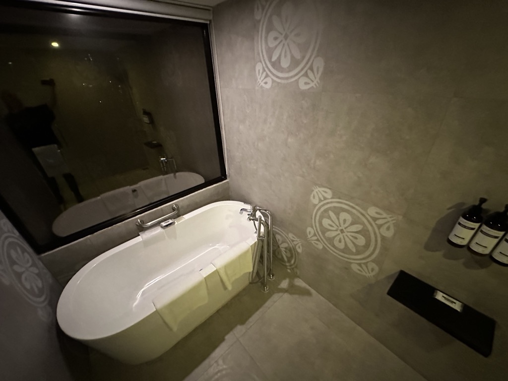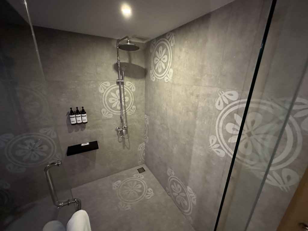 Links davon ging ein Flur ab, in dem die Minibar, Kaffeemaschine und der Wasserkocher standen. Gegenüberliegend befinden sich hier einmal das WC, welches eine Schiebetür hat und das großzügige Badezimmer mit Meerblick, begehbarer Dusche und Badewanne. Trotz mehrmaligem Fragen an verschiedenen Tagen war es immer etwas schwierig genügend Handtücher für uns und die Jungs zu bekommen. Diese mussten wir nahezu täglich nachbestellen. Unabhängig davon war das Badezimmer sehr schön, hell und extrem sauber.