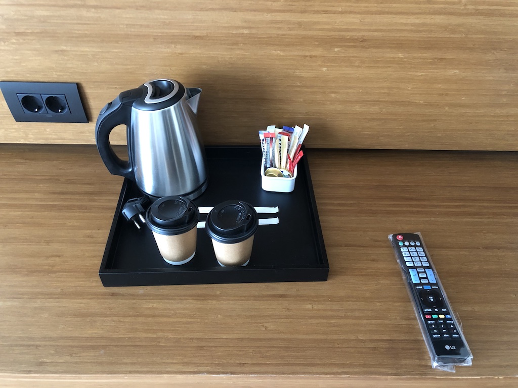 Gläser und Tassen waren bei meinem letzten besuch in den Zimmern verschwunden, für Tee und Kaffee (oder zum Zähne putzen) gab es Papierbecher. Zur Zubereitung stand ein Wasserkocher sowie zwei kleine Wasserflaschen bereit.