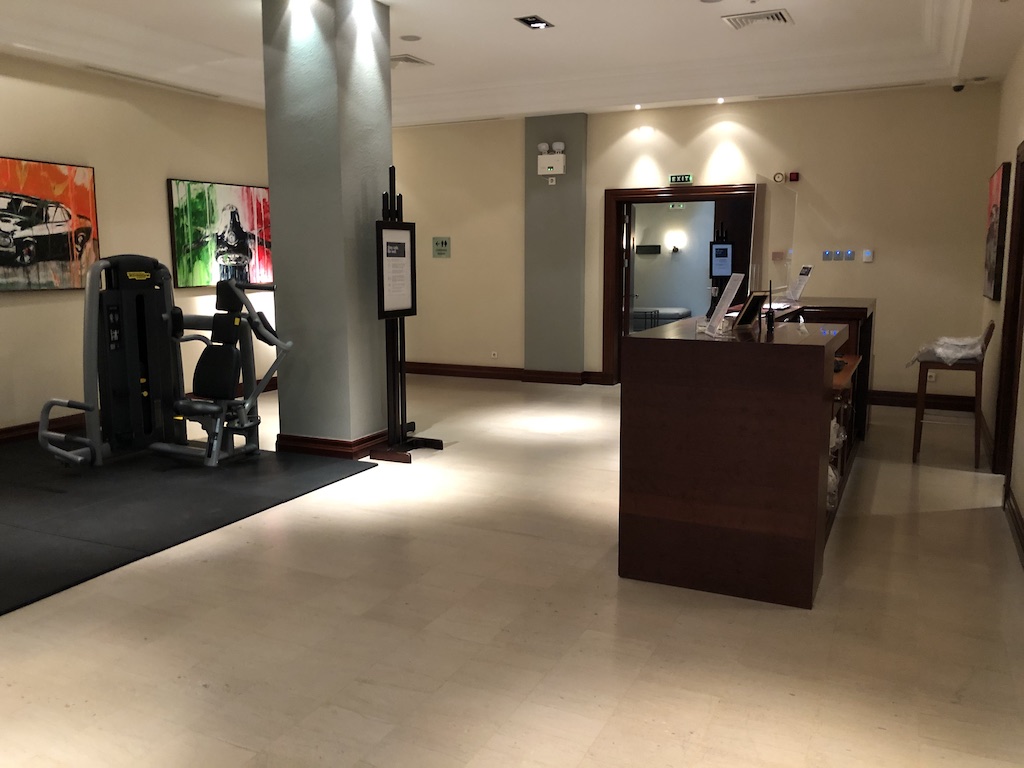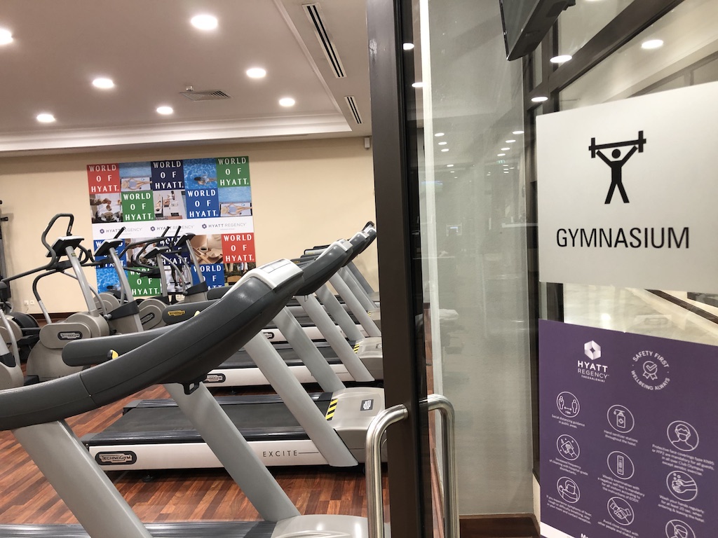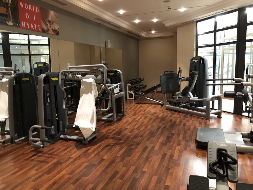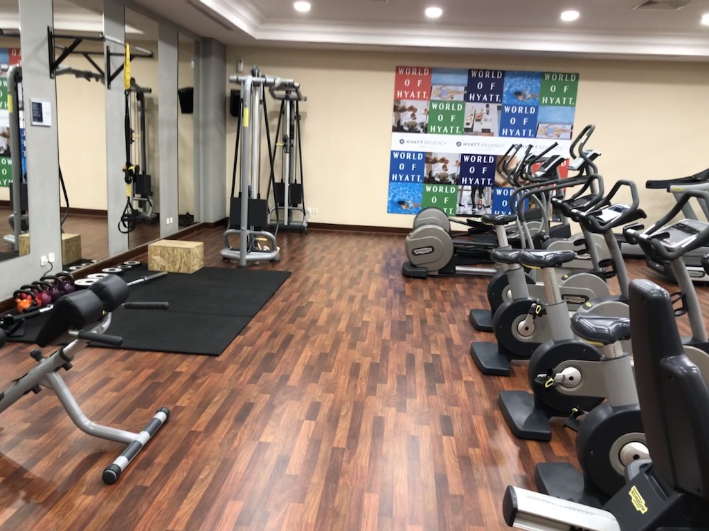 In drei Bereichen stehen zahlreiche Gerätschaften zur körperlichen Betätigung bereit. Handtücher, Wasser und sogar verschiedene Kabel zum Aufladen von Smartphones sind vorhanden.