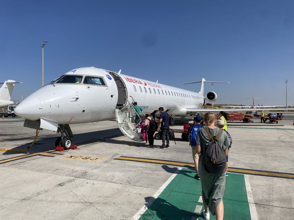 Das war schon mal sportlich für so einen Vormittag. Und als wären wir nicht schon genug gelaufen, ging es nach kurzer Wartezeit nochmals ein Stück zu Fuß über das Vorfeld bis zum Flugzeug, wo dann über die Treppe der CRJ-1000 eingestiegen wurde. Das, was ich sonst gerne als Ryanair-„Walk of shame“ beschreibe, gibt es als auch bei Iberia, wenn man mit dem Regionalableger Air Nostrum fliegt.