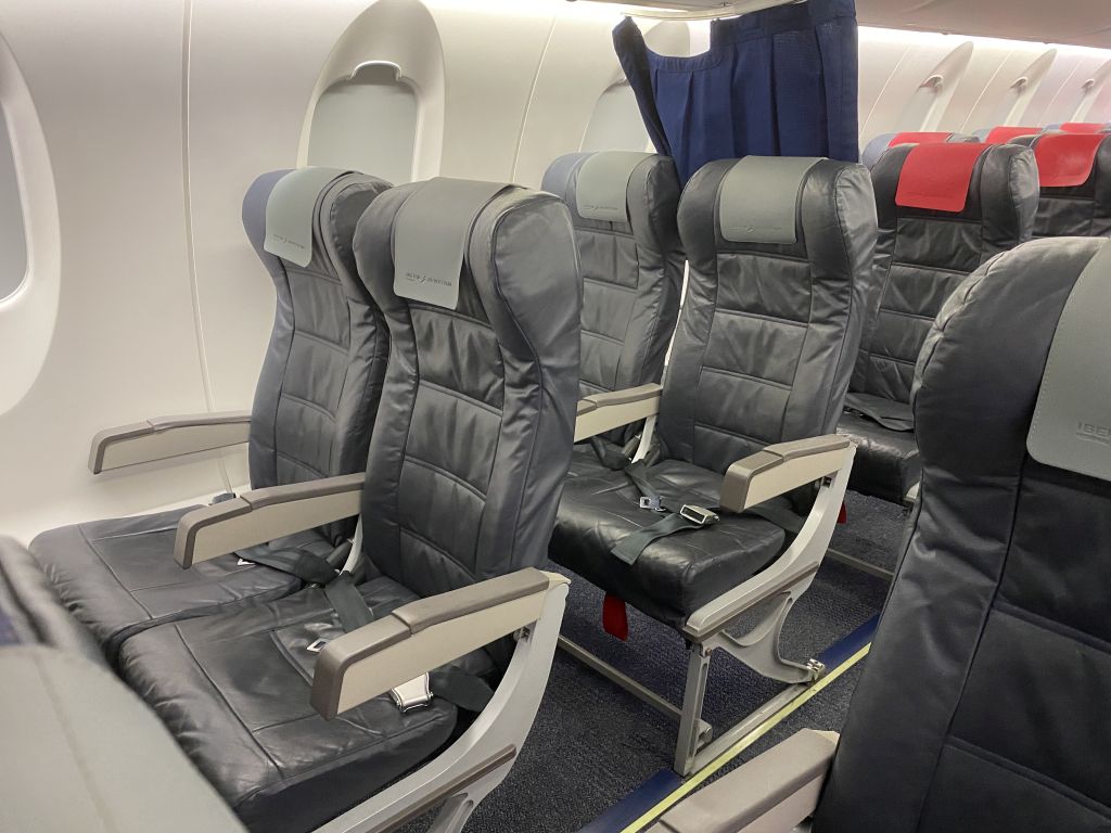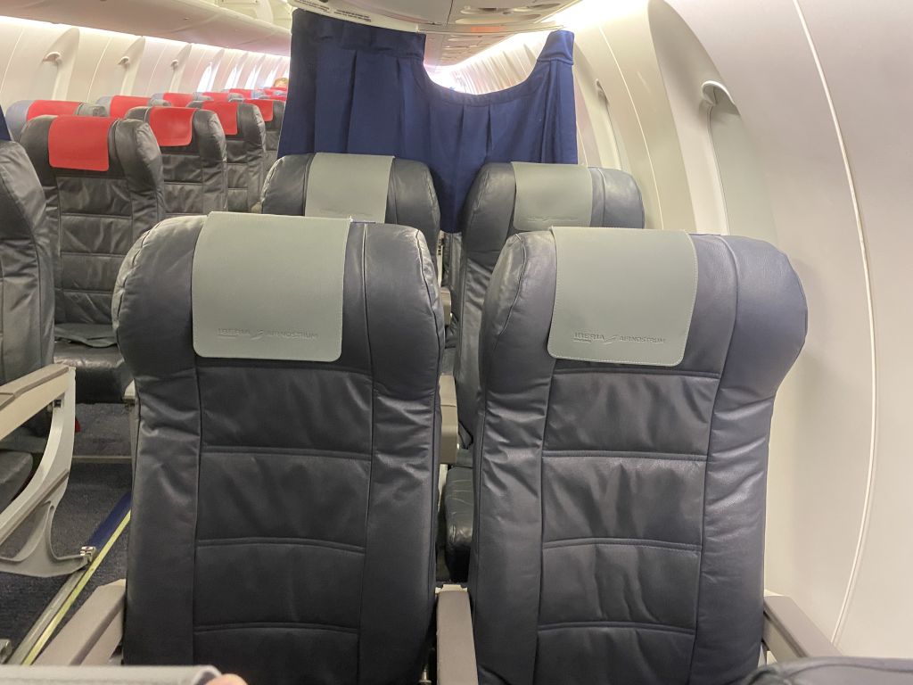 Der Iberia Express Airbus A321neo hatte natürlich mehr Glanz und Glitter, als ich nun auf dem Anschlussflug erwartete. Und obwohl die EC-MPA ebenfalls erst junge fünf Jahre alt war, wirkte die Kabine natürlich deutlich weniger modern mit Ihren klobigen Ledersitzen.