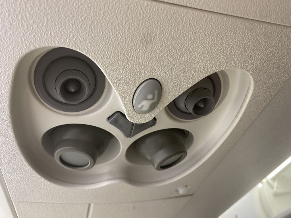 Business Class Reisende sollten sich darauf freuen können, dass der eine Nebenplatz frei bleibt. Auf diesem Flug waren die ersten beiden Reihen für Business Class Gäste reserviert. Danach trennte ein Vorhang die höhere Reiseklasse von der Economy Class. Nur ein weiterer Gast verirrte sich an diesem Tag in die Business Class. Er entschied sich für Sitz 1F, der mit 1D als einzige mit Extra-Legroom eine gemischte Bewertung bei Seatguru erhält. Doch damit liegt Seatguru nicht ganz korrekt, denn auch 2A und 2C vor dem Bulkhead haben ebenfalls etwas mehr Beinfreiheit.