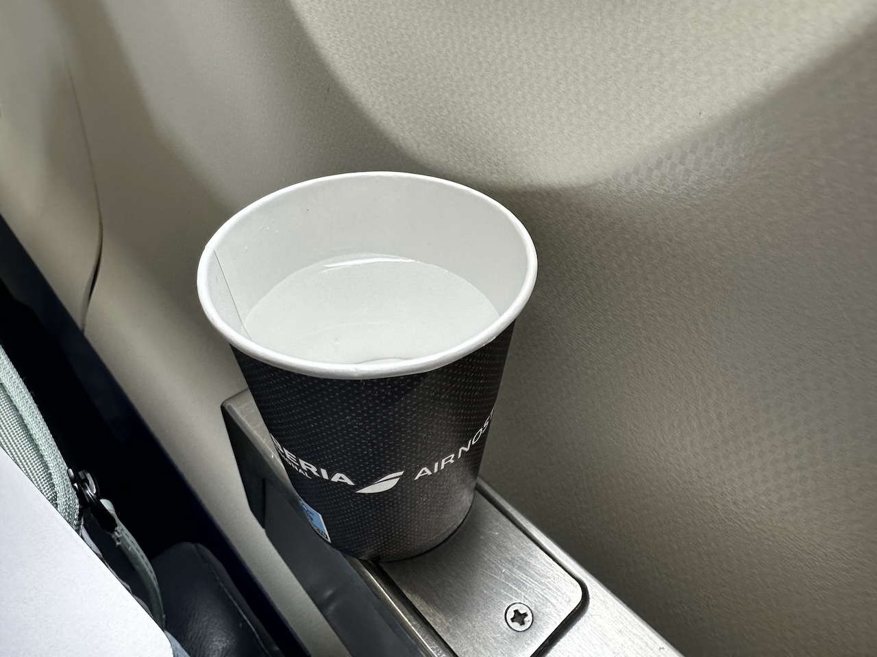 Scheinbar waren wir noch von den Ausläufern des Morgens betroffen, an jenem Tag behinderten einige „Klimakleber“ den Betrieb am Airport. Eine entsprechende Information gab es auch nicht (zumindest nicht auf englisch) als wir endlich an Bord waren und der Kapitän eine Ansage machte. Es dauerte noch eine weitere Stunde bis wir uns dann in Bewegung setzten. Immerhin verteilten die Flugbegleiterinnen Becher mit Wasser.
