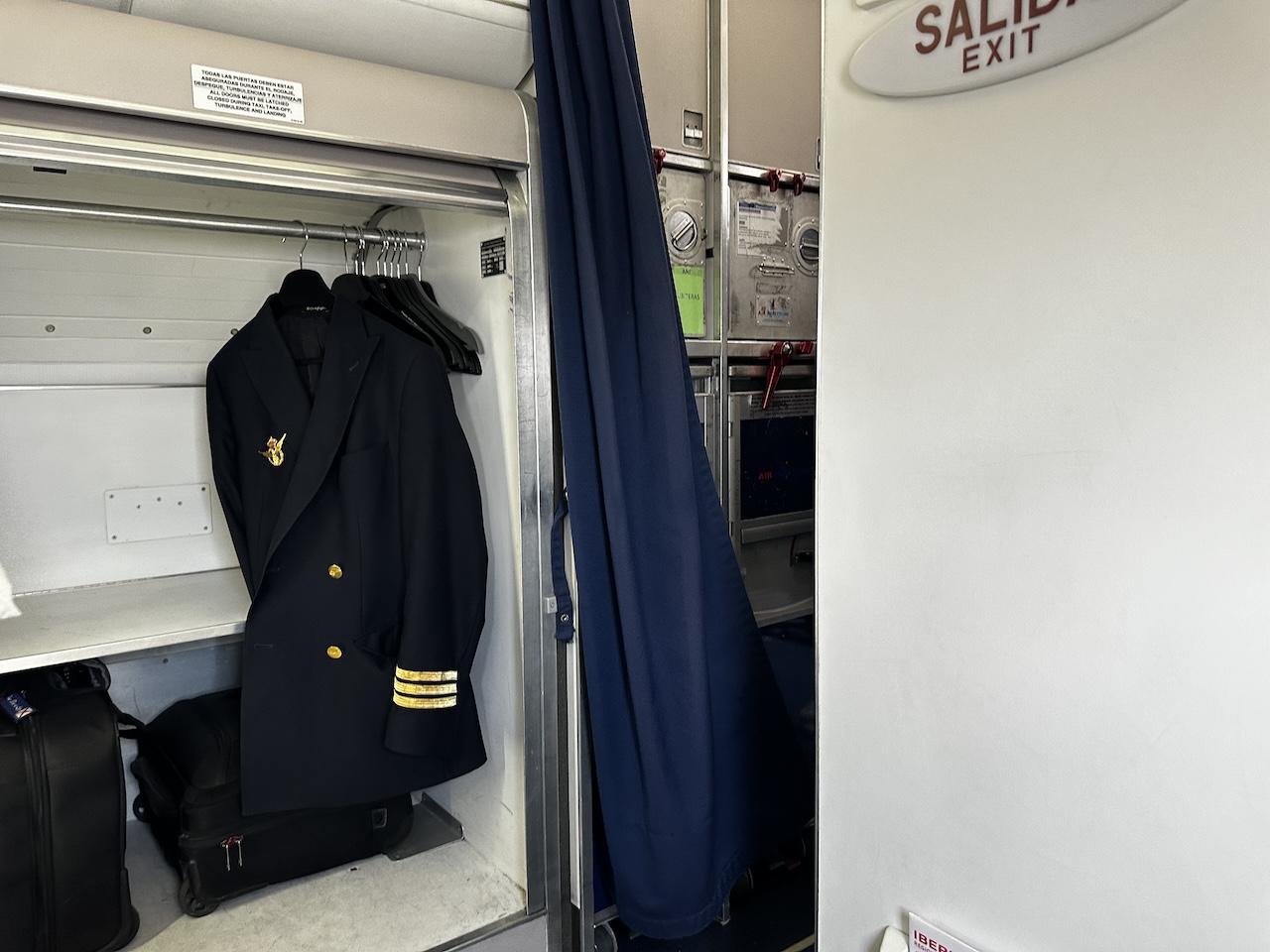 Obwohl man größere Handgepäckstücke beim Einsteigen neben der Flugzeugtreppe abstellen konnte, gab es zum Ende des Boardings Probleme mit den überzähligen Taschen und Koffern, die dann kurzerhand in der Garderobe gestapelt werden mussten.