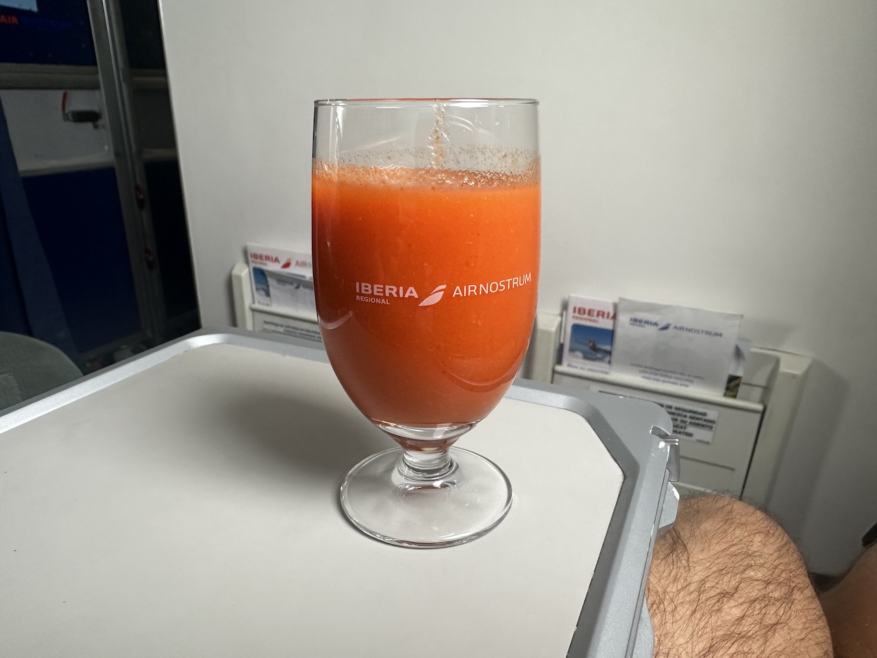 Als es dann endlich in die Luft ging, machte sich die Crew zügig an die Arbeit. In der Business Class wurden Wasser und Gazpacho quasi als Willkommensgetränk serviert.