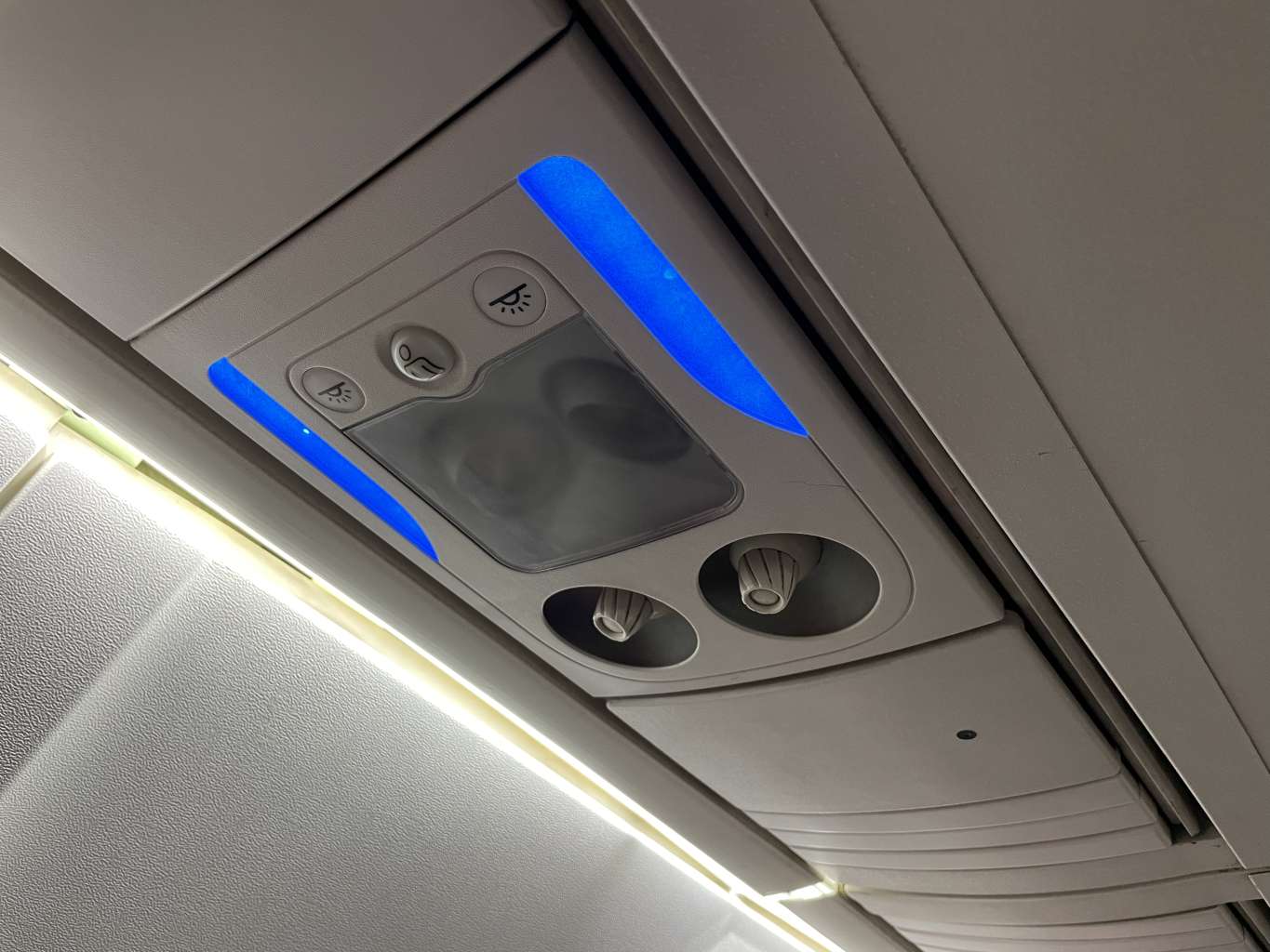Meine Tasche konnte ich in dem Fach über mir verstauen und im Vordersitz war ein kleiner ausklappbarer Tisch eingebaut. Über meinem Platz gab es verstellbare Luftdüsen und ein Leselicht.