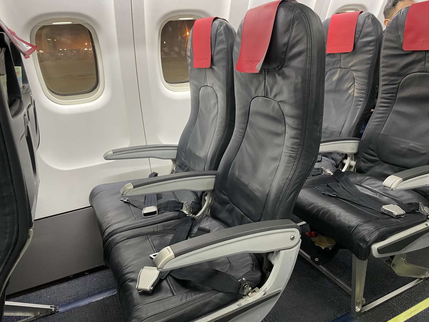 Die Kabine wirkt für das Flugzeugmodell noch recht modern. Die Sitze entsprechen dem heutigen Standard und sind eher slim-line. Der Sitzabstand liegt bei 30 Zoll und die Sitzbreite bei 17 Zoll. Für einen so kurzen Flug doch sehr komfortabel.