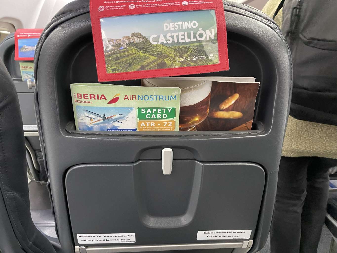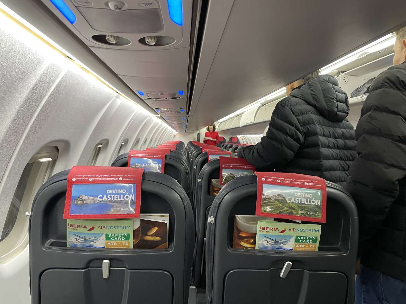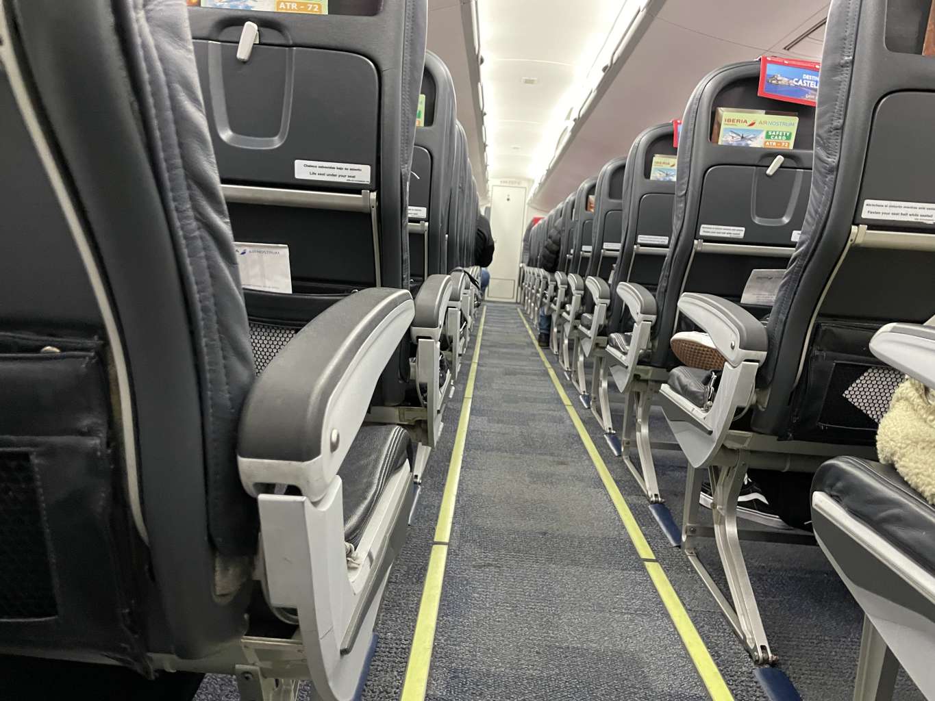 Die ATR72-600 von Iberia wird von Air Nostrum betrieben und ist mit 72 Standardsitzen ausgestattet. Die Sitzreihen gehen dabei vom hinteren Teil des Flugzeugs bei Reihe 1 los und enden im vorderen Teil der Kabine bei Reihe 20. Wobei Reihe 1 nur auf den Plätzen A und C existiert und auf meinem Flug als „Business Class“ ausgezeichnet war. Reihe 20 verfügt hingehen nur über die Sitze D und F, welche gegen die Flugrichtung angeordnet sind und eher wie Jumpseats für die Crew wirken.