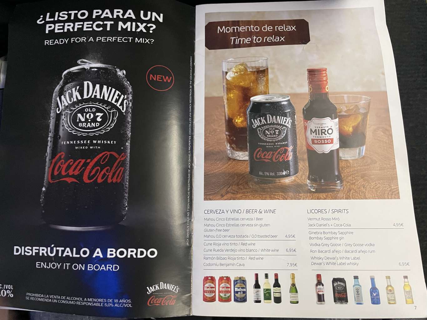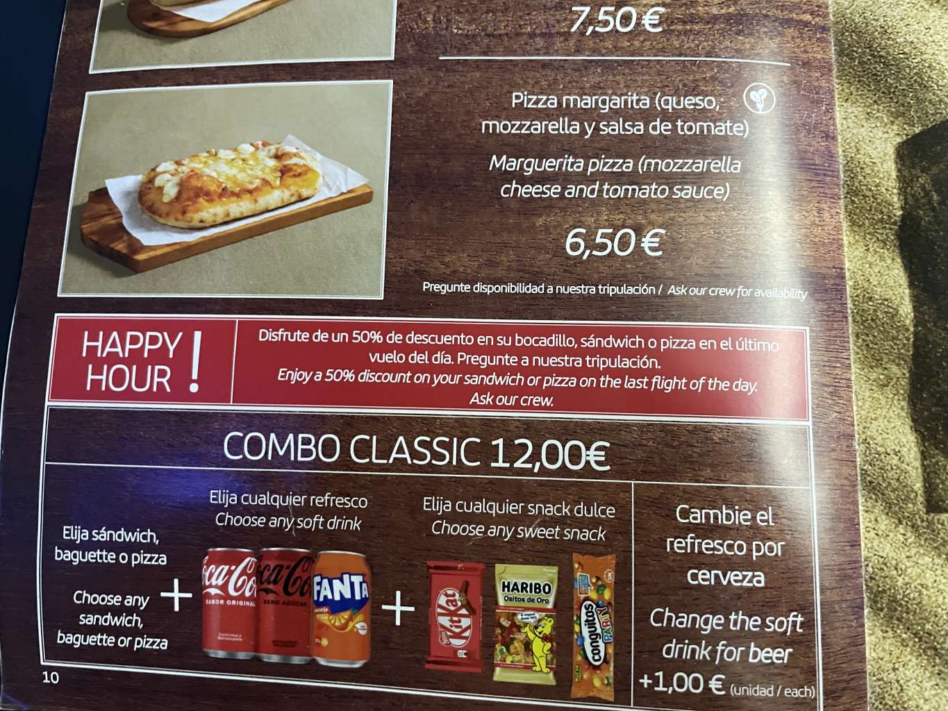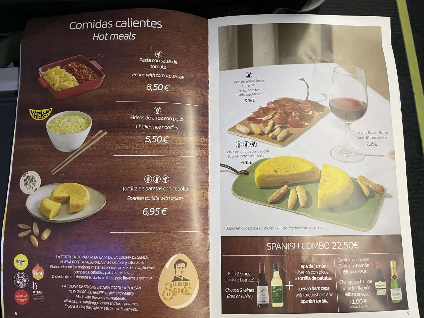 So gab es natürlich spanische Tapas, die zwischen 4,50 und 6,95 Euro lagen. Auch der Jack Daniels Cola war mit 4,95 Euro ziemlich günstig. Für das Bier müsst Ihr allerdings ebenfalls 4,95 Euro hinlegen und Sandwiches gibt es erst ab 6,50 Euro. Auf der Speisekarte fanden sich auch warme Optionen, wie Instantnudeln oder Penne mit Tomatensoße. Ich vermute, dass es die so auf meinem Flug nicht gegeben hätte.
