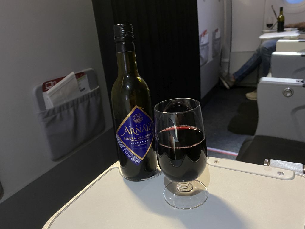 Doch bevor das Abendessen serviert wurde, nahm die Crew noch den Getränkewunsch auf. In Ermangelung einer Karte entschied ich mich für einen Rotwein, der in einer kleinen Flasche serviert wurde.