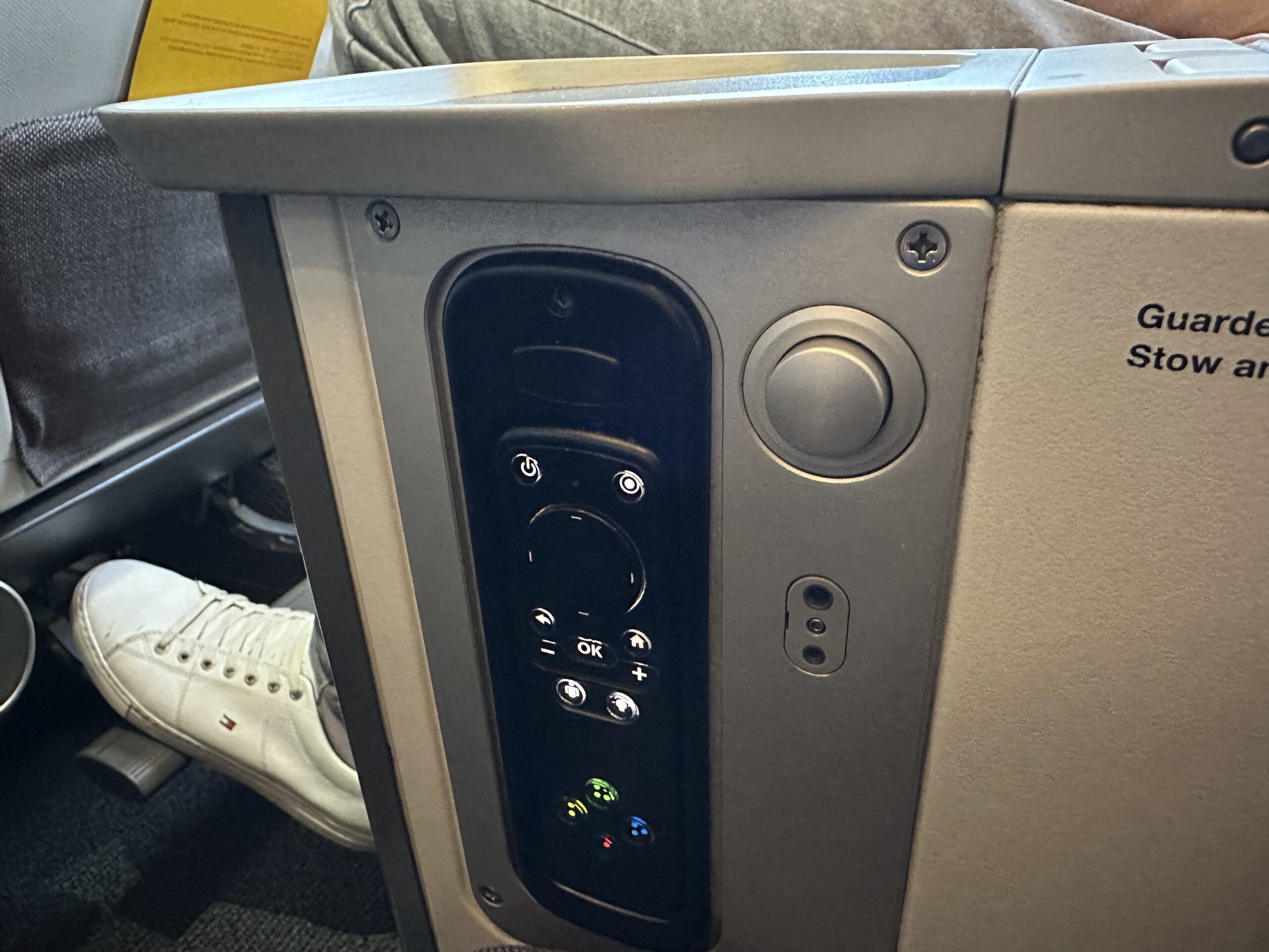Die Stewardessen haben uns vergessen oder ignoriert…schade, wir haben uns davon aber nicht weiter beeindrucken lassen- es war nur eine weitere verpasste Chance. Ansonsten kann man es auf den Sitzen gut längere Zeit aushalten, wobei der Monitor beim Zurückstellen der Rückenlehne ziemlich nah ans Gesicht und weit nach unten gestellt wird. Spricht für einen Sitzplatz in der ersten Reihe- dort ist der Fernseher unterm Sitz gestaut und an einem Arm herausziehbar.