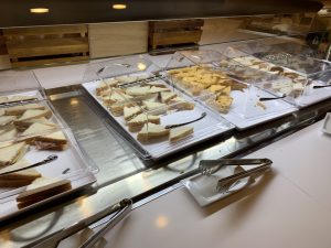 An zwei Buffets in der Iberia Lounge in Madrid wurden verschiedene Speisen und Getränke angeboten. Hierbei gab es vorrangig Snacks wie Sandwiches und Salate auf dem Buffet. Interessanterweise wurden gerade auch warme Speisen für das Abendessen auf dem Buffet aufgebaut, als ich die Lounge verlassen habe. Zu diesem Zeitpunkt war es allerdings schon kurz vor 8 Uhr am Abend – In Spanien isst man nunmal später zu Abend.
