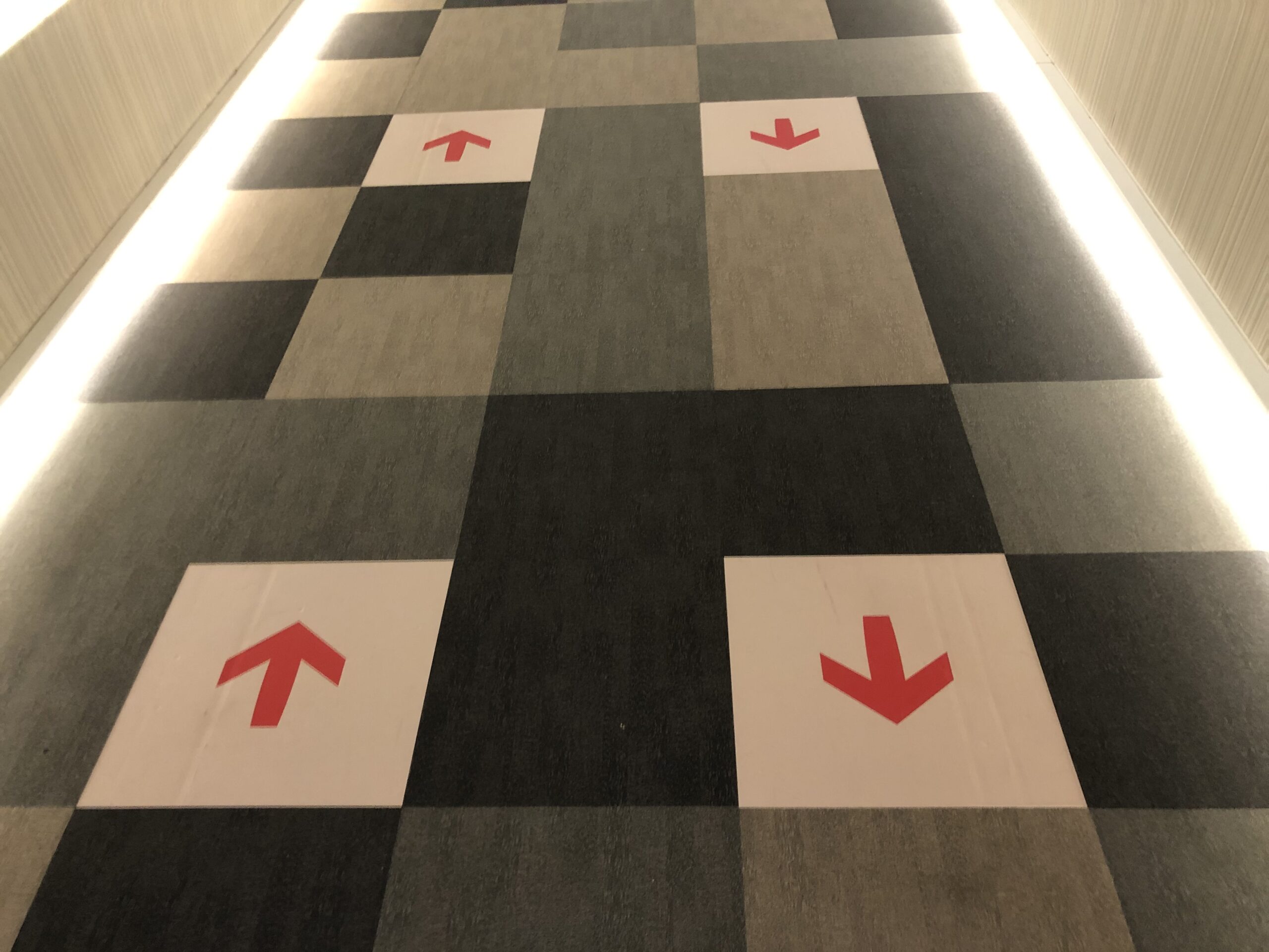 Zahlreiche Pfeile wurde angebracht um Passagierströme zu lenken, die vielen Sticker und Schilder sind gleichzeitig auch verwirrend und erfüllen nicht immer ihren Zweck. Einige Sitzmöglichkeiten wurden ganz entfernt, andere auseinander gezogen um für Abstand zu sorgen.