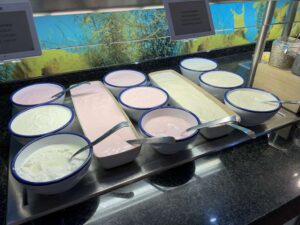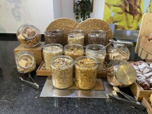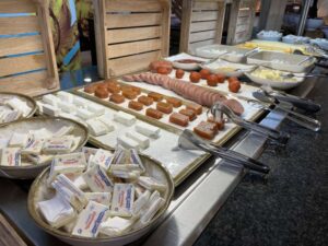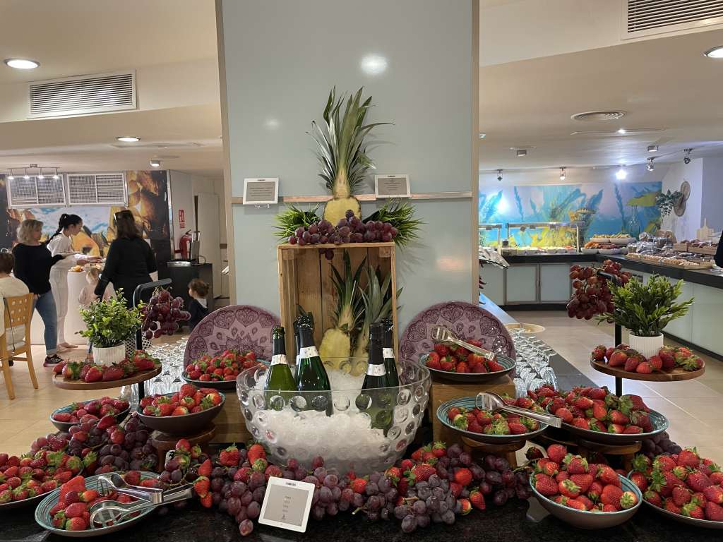 Und es gibt auch Alkohol. Cava steht beim Frühstück zur Selbstbedienung bereit. Und im April 2024 sogar auf einem verschwenderisch großen Berg von Erdbeeren.
