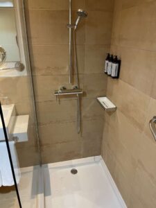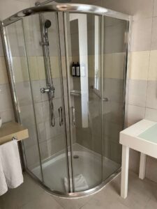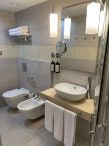 Das Badezimmer war an das Schlafzimmer angegliedert und verfügte neben dem WC auch über ein Bidet. Die Dusche war allerdings deutlich kleiner als im vorherigen Familienzimmer. Dafür gab es noch einen Schminktisch, den ich mangels Schreibtisch als Arbeitsplatz zweckentfremdete.
