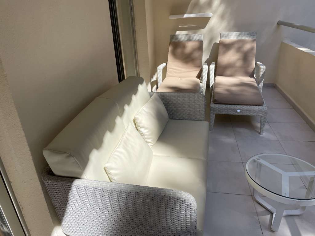 Hinter einem Raumteiler erstreckte sich dann der Wohnbereich mit einer Eckcouch, die in unserem Fall für die Kinder aufgebettet war. Auf einem Sideboard stand hier auch der Flachbildfernseher und über eine Glastür ging es auf die Terrasse mit einem kleinen Tisch und vier Stühlen. Über die Poollandschaft, vorbei an einem anderen Gebäude, hatten man den versprochenen Meerblick.