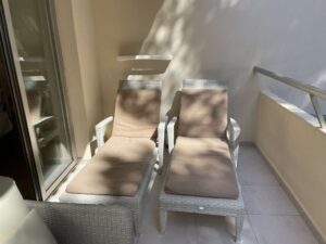 Die Junior Suite hätte in meinen Augen auch als echte Suite durchgehen können, denn sie bestand aus zwei vollwertigen Zimmern. Einem Wohnraum mit Schlafcouch, begehbarem Kleiderschrank und Einheit für Kühlschrank, Wasserkocher und Kaffeemaschine. Das zweite Zimmer war das Schlafzimmer mit großzügigem Doppelbett. Von beiden Räumen konnten wir die breite Terrasse betreten und uns auf einer der Liegen oder der Sitzgruppe niederlassen.
