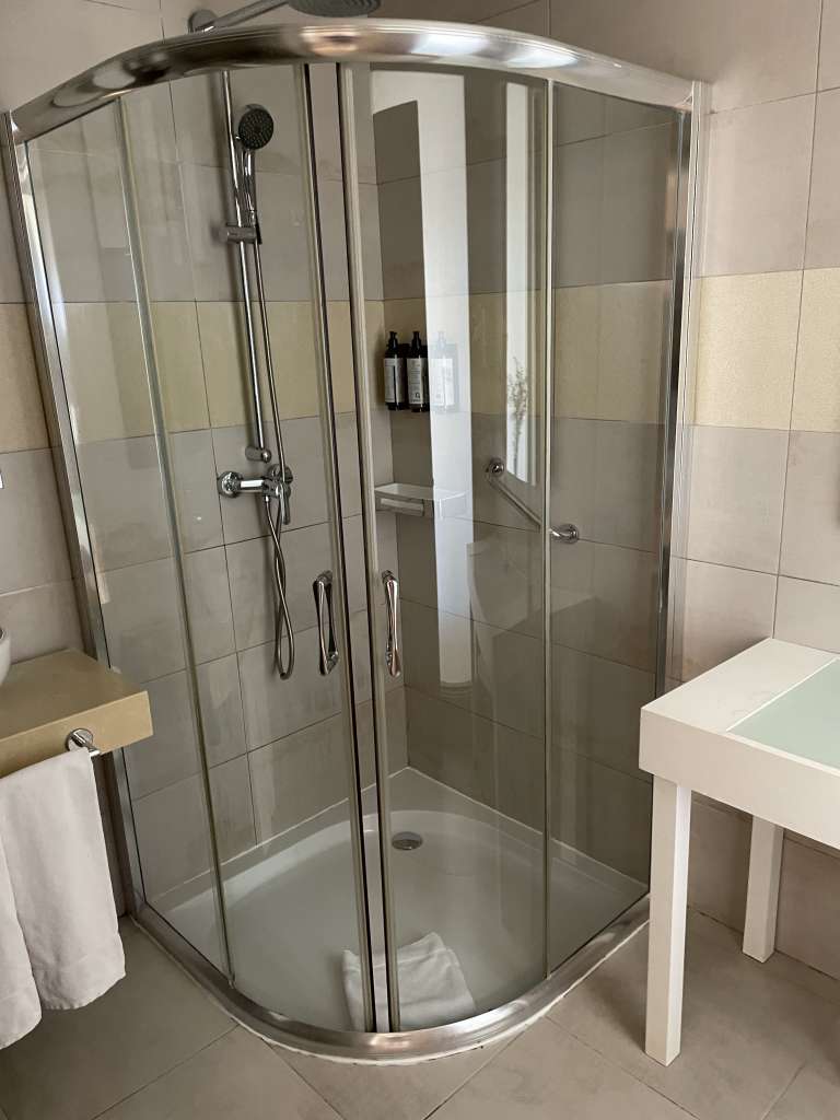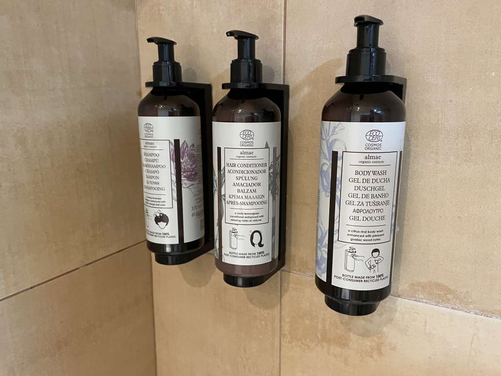 Das Bad war ebenfalls sehr modern eingerichtet und die ebenerdige Dusche bot ausreichend Platz. Die Pflegeprodukte waren aus der Linie almae organic extracts, die mir bisher noch nie begegnet war. Das Fehlen eines Bidets war für ein spanisches Resort dann doch eher unüblich. Auch auf die Badewanne musste man wohl aus Platzgründen verzichten.